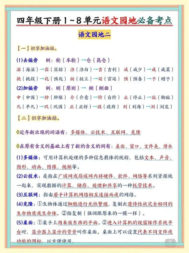 四年级下册语文《1-8单元必备考点》,电子版可打印