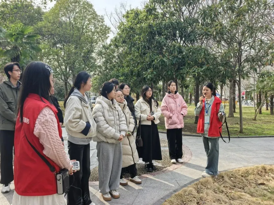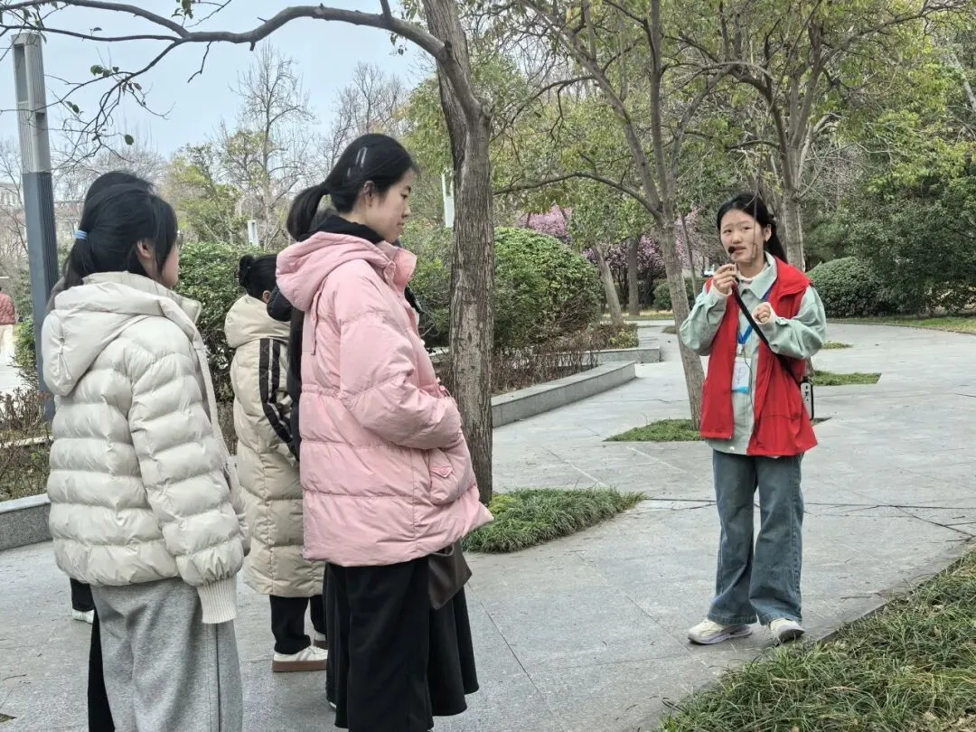 在春风轻拂、绿意初萌的“草木讲堂”户外科普活动中,讲解员身着醒目的红色志愿马甲,站在步道旁,带领同学们认识了许多草木,如花蕾能疏肝解郁的美人梅;攀援向上、能活血通经的凌霄;叶片如扇形、有着“活化石”美誉的银杏树;枝干苍劲、果实可强筋健骨的杜仲;早春先花后叶、洁白高洁的望春玉兰;针叶苍劲、可祛风除湿的油松;可解毒消肿的乌桕;花型多样、被誉为“花中皇后”的月季;四季常青、可祛风明目的女贞;花团锦簇、象征亲情的紫荆花;可润肺清心、养阴生津的麦冬……讲解员用生动的语调,让枯燥的知识点在鲜活的场景里变得可感可知。