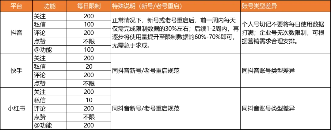 连续开展营销动作1-2周后,需暂停所有营销操作,进行2-3天的养号。切忌持续10天半月都做同一个营销动作,否则易被平台判定为营销号。