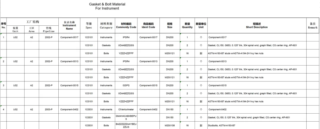 仪表紧固件材料报表成品