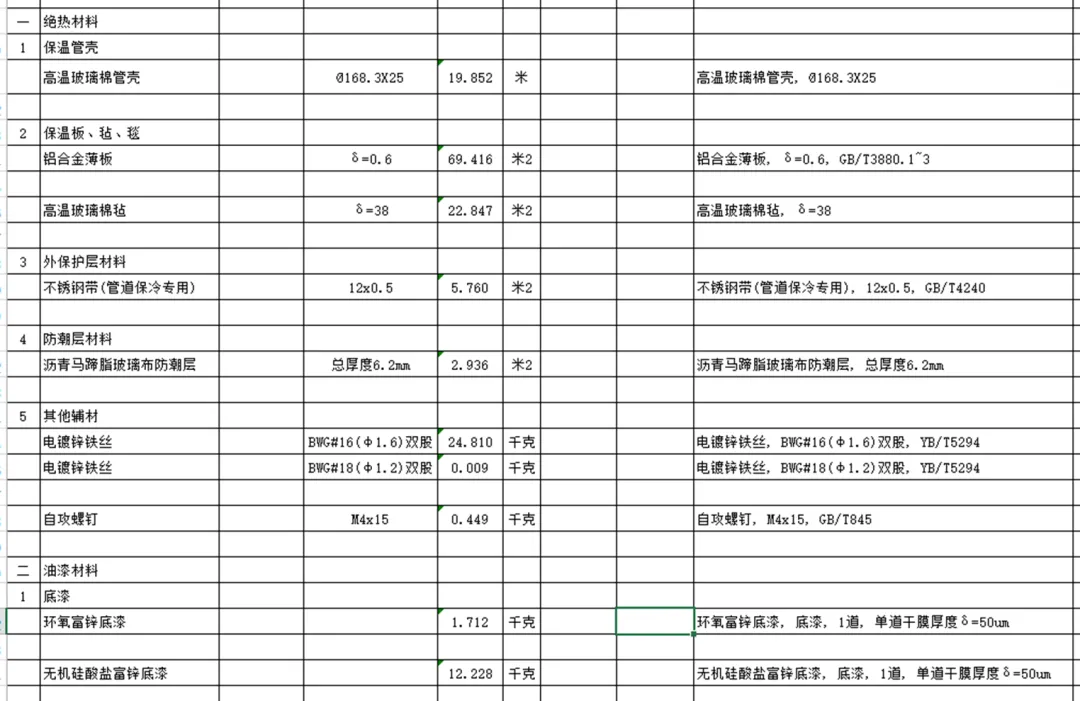 保温、涂漆综合材料表成品