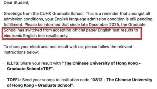 近日,香港中文大学研究生院正式发布官方通知,迎来重磅政策调整:自2025年12月起,雅思成绩送分方式全面升级,学校仅接受电子版成绩单,不再接收任何纸质版原件。