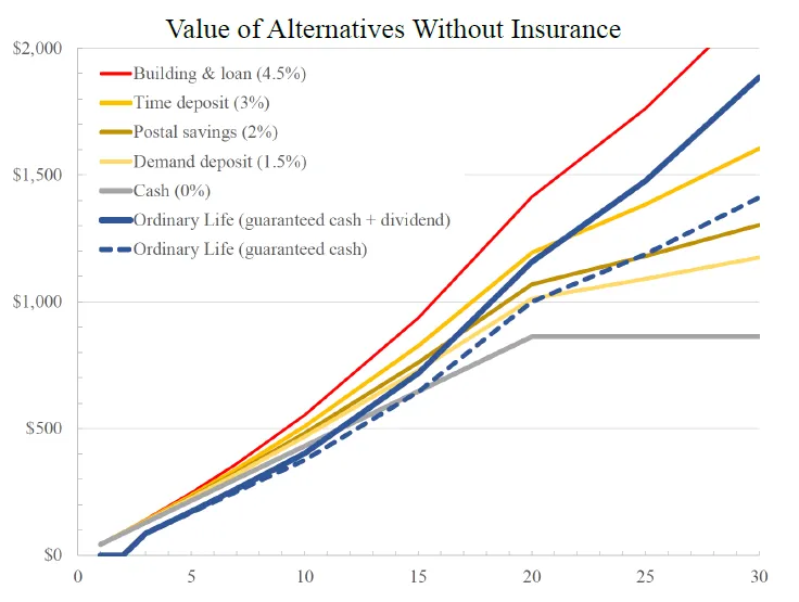 与替代品比较,普通寿险在长期内表现突出。图1展示了具体数据:投资普通寿险20年后,价值达1000美元,而邮政储蓄(利率2%)仅879美元,股票(假设市场平均)在萧条期大幅波动。普通寿险的回报几乎与股票、房地产负相关,提供分散化好处。