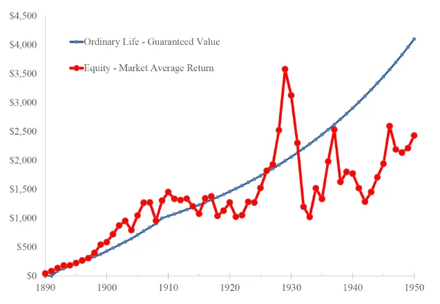 与银行存款相比,普通寿险更稳定:银行在恐慌期(如1907、1930年)常冻结资金,而寿险公司全国运营,提供本地服务。与股票和房地产相比,普通寿险门槛低,适合小投资者,且波动性小。图2显示,1890-1950年间,普通寿险回报长期优于股票,因后者在1929年后长期低迷。
