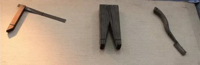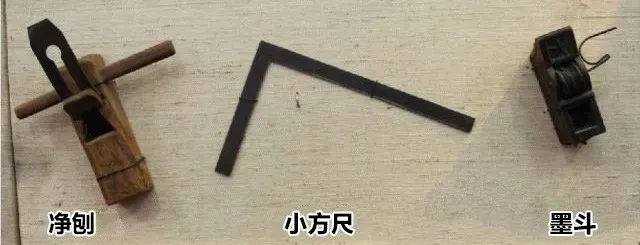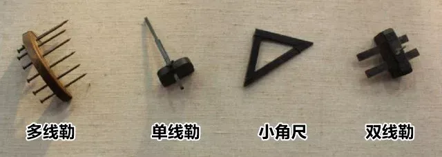 墨斗:墨斗的原理是由墨线绕在活动的轮子上墨线经过墨斗轮子缠绕后,端头的线拴在一个定针上。使用时,拉住定针,在活动轮的转动下,拉直墨线在木材上弹出需要加工的线。