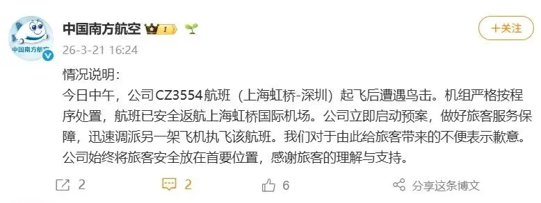 刚刚,南航发布CZ3554航班情况说明 ! 3月21日,中国南方航空发布公告,今日中午,公司CZ3554航班(上海虹桥-深圳)起飞后遭遇鸟击。机组严格按程序处置,航班已安全返航上海虹桥国际机场。公司立即启动预案,做好旅客服务保障,迅速调派另一架飞机执飞该航班。我们对于由此给旅客带来的不便表示歉意。公司始终将旅客安全放在首要位置,感谢旅客的理解与支持。