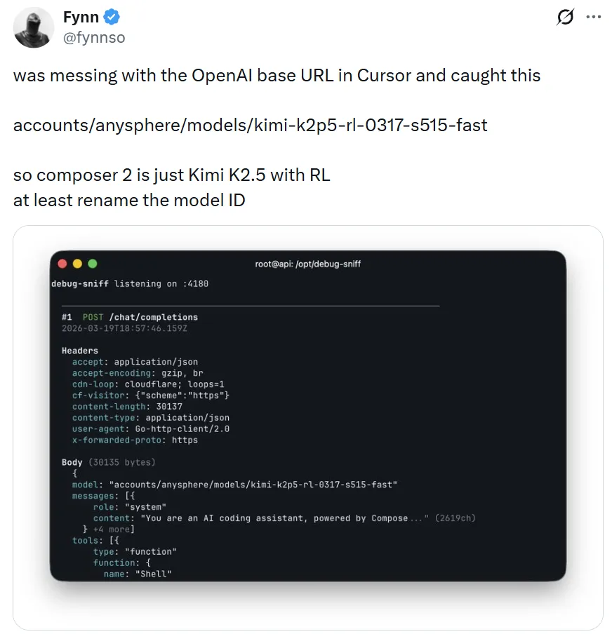 有开发者在使用Composer 2时,偶然在日志里发现了一行奇怪的代码:accounts/anysphere/models/kimi-k2p5-rl-0317-s515-fast
