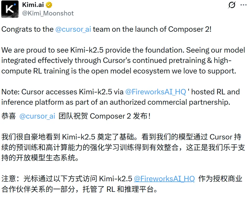 “恭喜Cursor团队发布Composer 2!我们自豪地看到Kimi K2.5为其奠定基础。看到我们的模型通过Cursor的持续预训练与高强度RL训练被高效集成,正是我们乐于支持的开放模型生态。