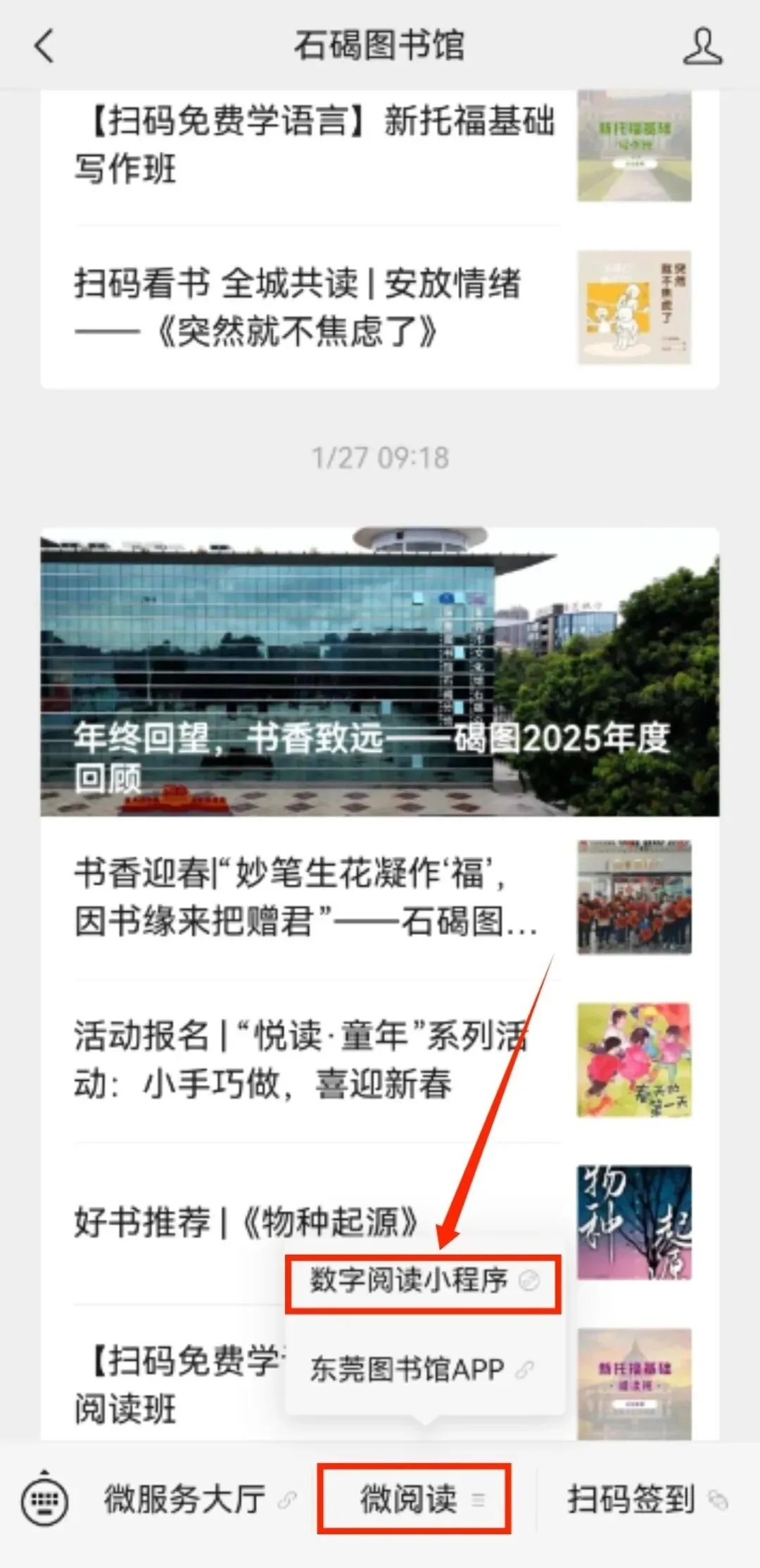 (1)石碣图书馆微信公众号底部菜单栏“微阅读”——“数字阅读小程序”;