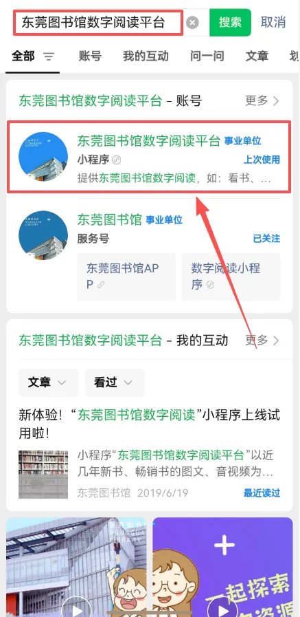 (2)微信检索栏直接搜索“东莞图书馆数字阅读平台”,选择对应小程序;