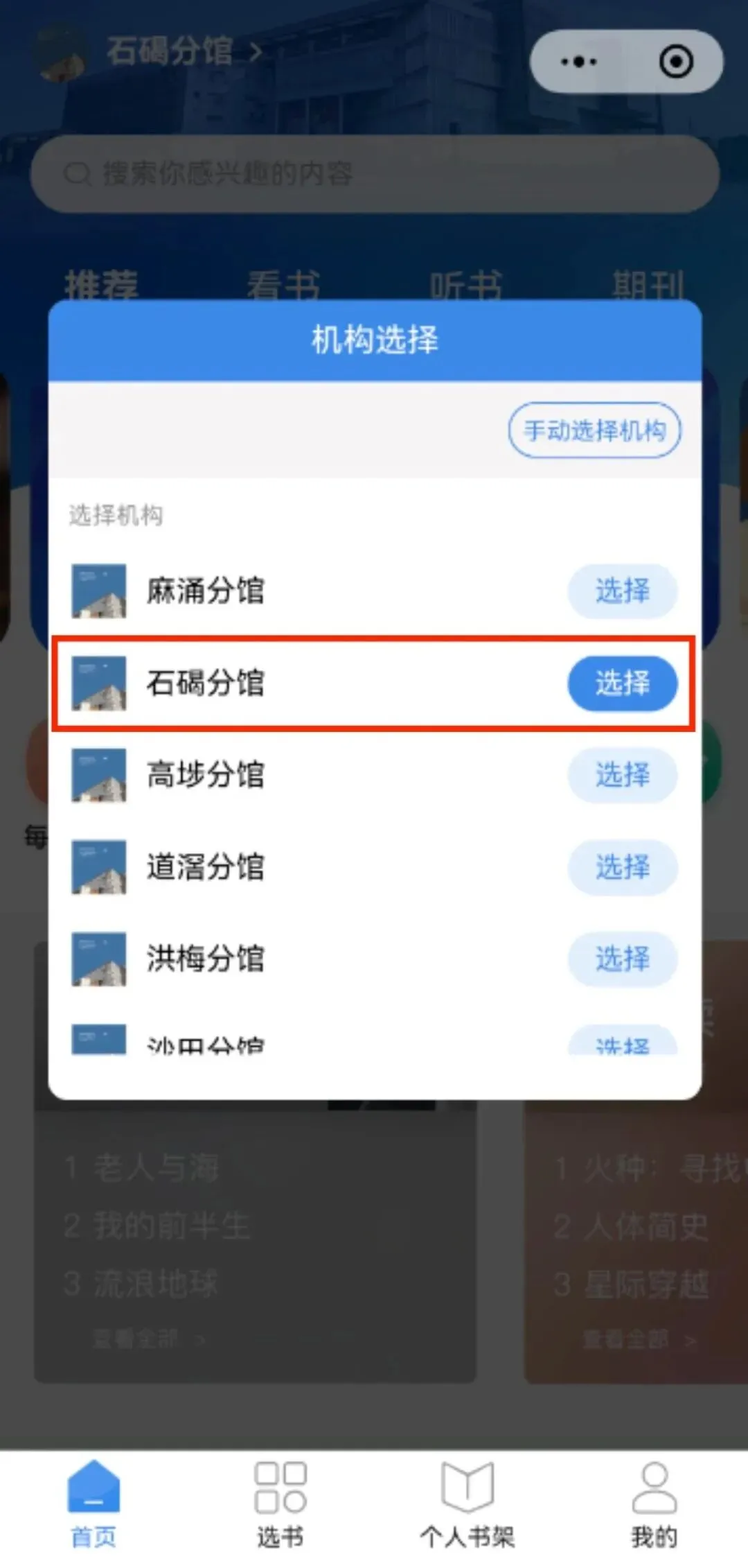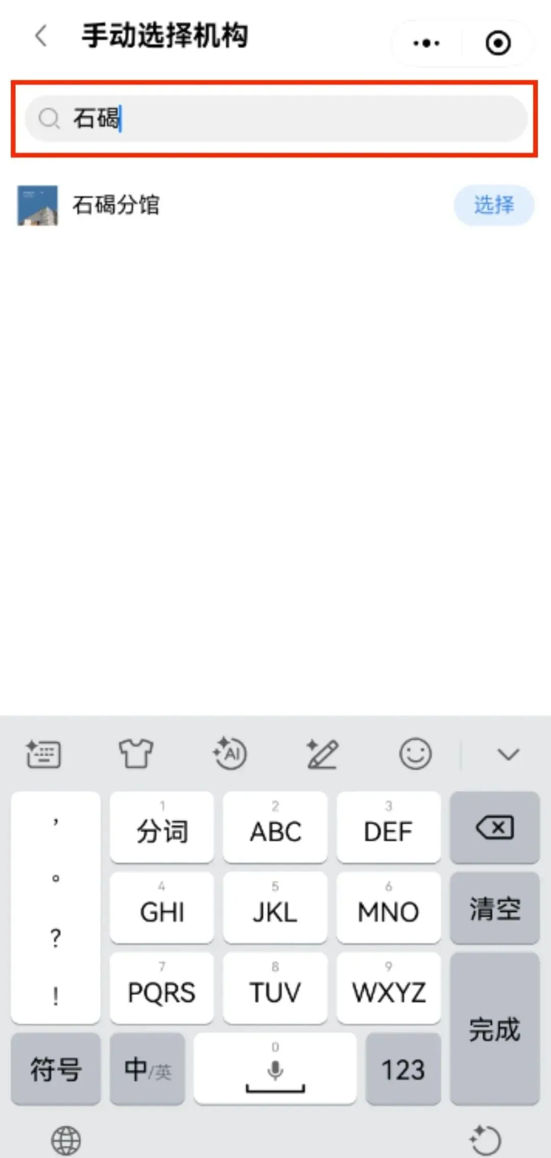 也可直接点击机构选择框右上角的手动选择机构,进入到搜索页面,输入石碣分馆即可。