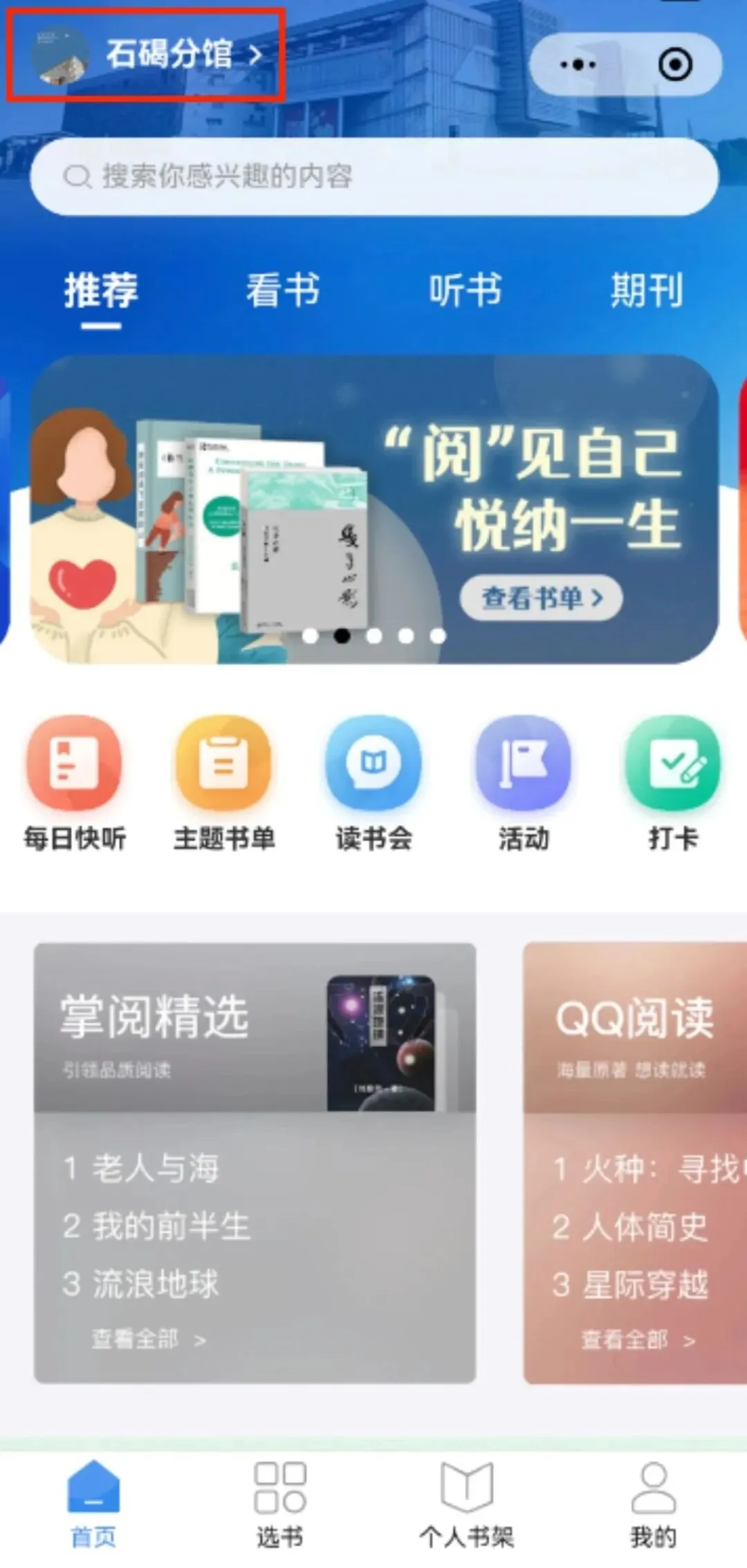 通过石碣图书馆公众号或微信检索第一次进入平台,默认是进入东莞图书馆总馆页面。用户首次登录总馆页面,三秒后会弹出机构选择框,如下图所示,选择石碣分馆进入后,页面左上角将切换为“石碣分馆”。