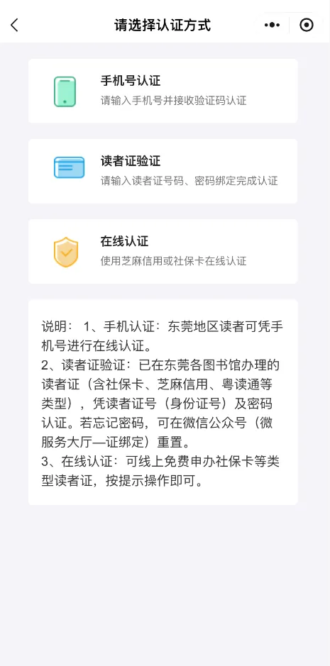 完成微信授权和手机号授权后,若阅读/播放资源则需要读者认证。点击资源详情页“阅读”“播放”等相关按钮将会跳到读者认证页面。读者认证主要有三种方式,选择其中任意一种进行认证即可,认证完就可以使用平台所有资源了。