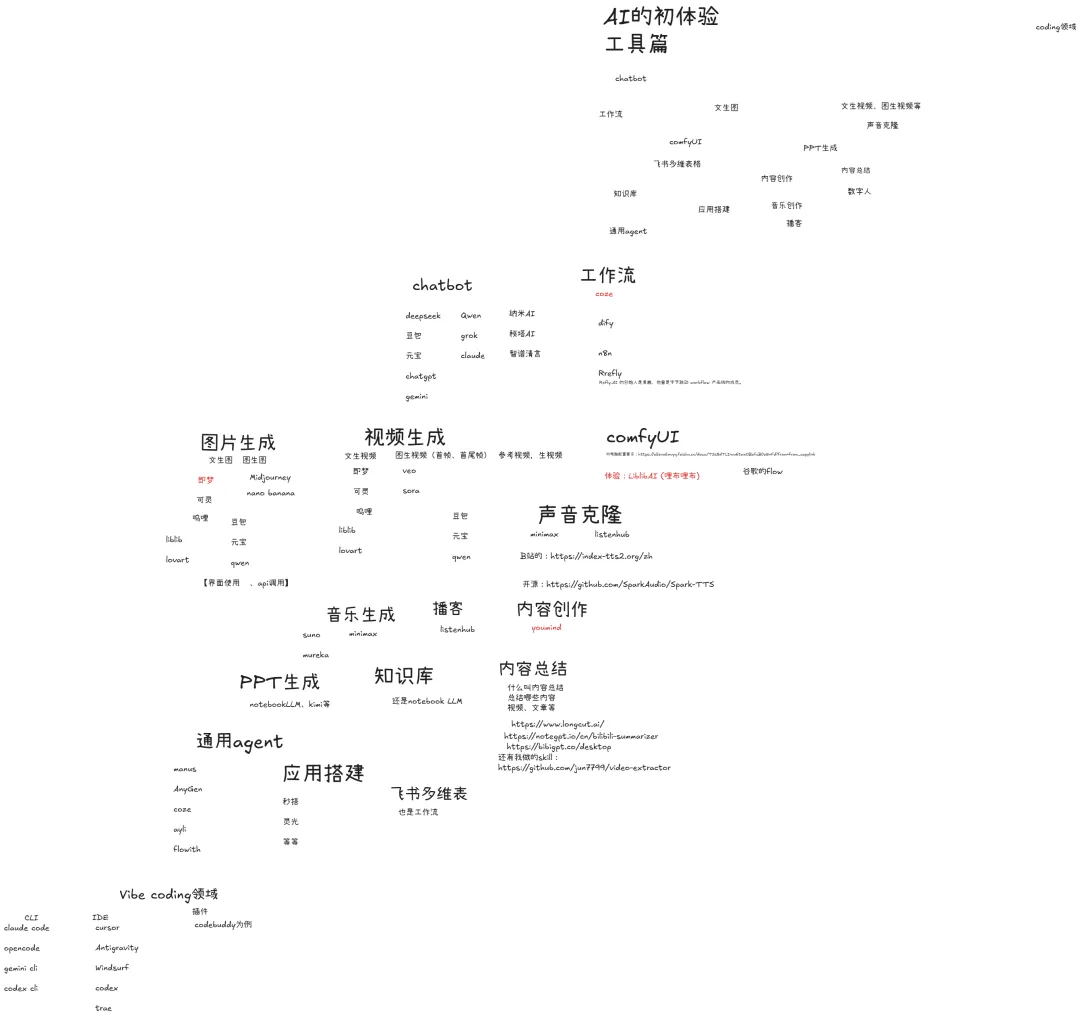 AI的初体验,第二弹:工具篇 || 下周开波 讲解内容应该会覆盖如下: 内容较多,点击大图,来看哈。 讲肯定讲不完, 只能说扫盲。 必要时打开界面给大家看看,有个印象。 要具体讲某个工具的话。 应该是coze、即梦、多维表 comfui也打开看一看。 coding方向的,再下一节课哈。 另外第一次课没听到的可以回看: https://e5zve6mvyq.feishu.cn/wiki/AmWqwBXeEiBoM6k5EkrcLDNCnqv?from=from_copylink 依然是限时免费哈: 超过100人就不好说啦!