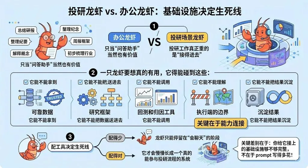 没有配好工具的龙虾,最多只是一个会聊天、会总结、会写点东西的助手。它可能能帮你聊观点,却不太能真正进入投研现场。