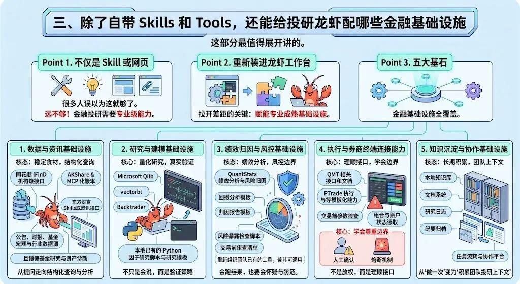 三、除了自带 Skills 和 Tools,还能给投研龙虾配哪些金融基础设施