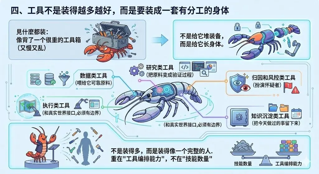 很多人一聊“给龙虾配工具”,很容易滑向另一种极端:见什么都装。