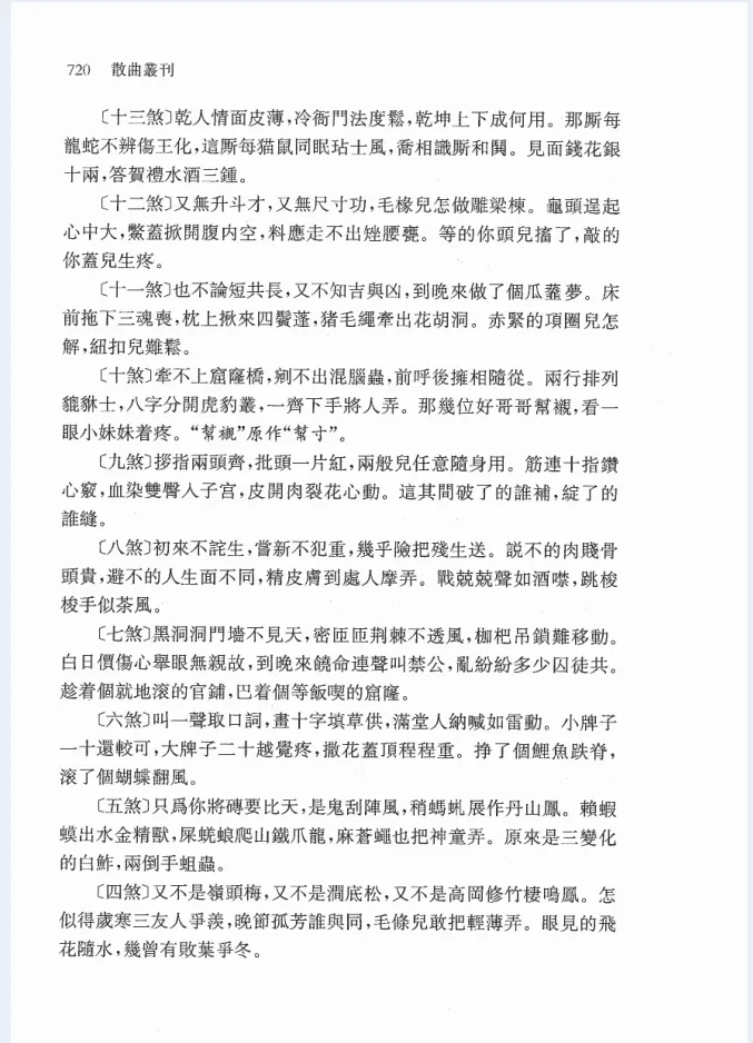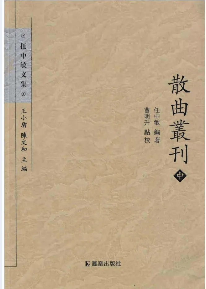 散曲总集。今人任中敏编。任中敏(1897~1991),原名讷,笔名二北、半塘,江苏扬州人。曾从吴梅学词曲,后任教于国内各大学。丛刊共收散曲著作15种。内收有元人选本2种:杨朝英《阳春白雪》、《乐府群玉》(有人以为胡正臣子胡存善所编)。元人专集4种:马致远《东篱乐府》,乔吉《梦符散曲》,张可久《小山乐府》,贯云石、徐再思《酸甜乐府》。明人专集 5种:康海《东乐府》,王磐《王西楼先生乐府》,冯惟敏《海浮山堂词稿》,沈仕《唾窗绒》,施绍莘《花影集》。清人总集1种:《清人散曲选刊》。任中敏论著3种:《作词十法疏证》、《散曲概论》、《曲谐》。