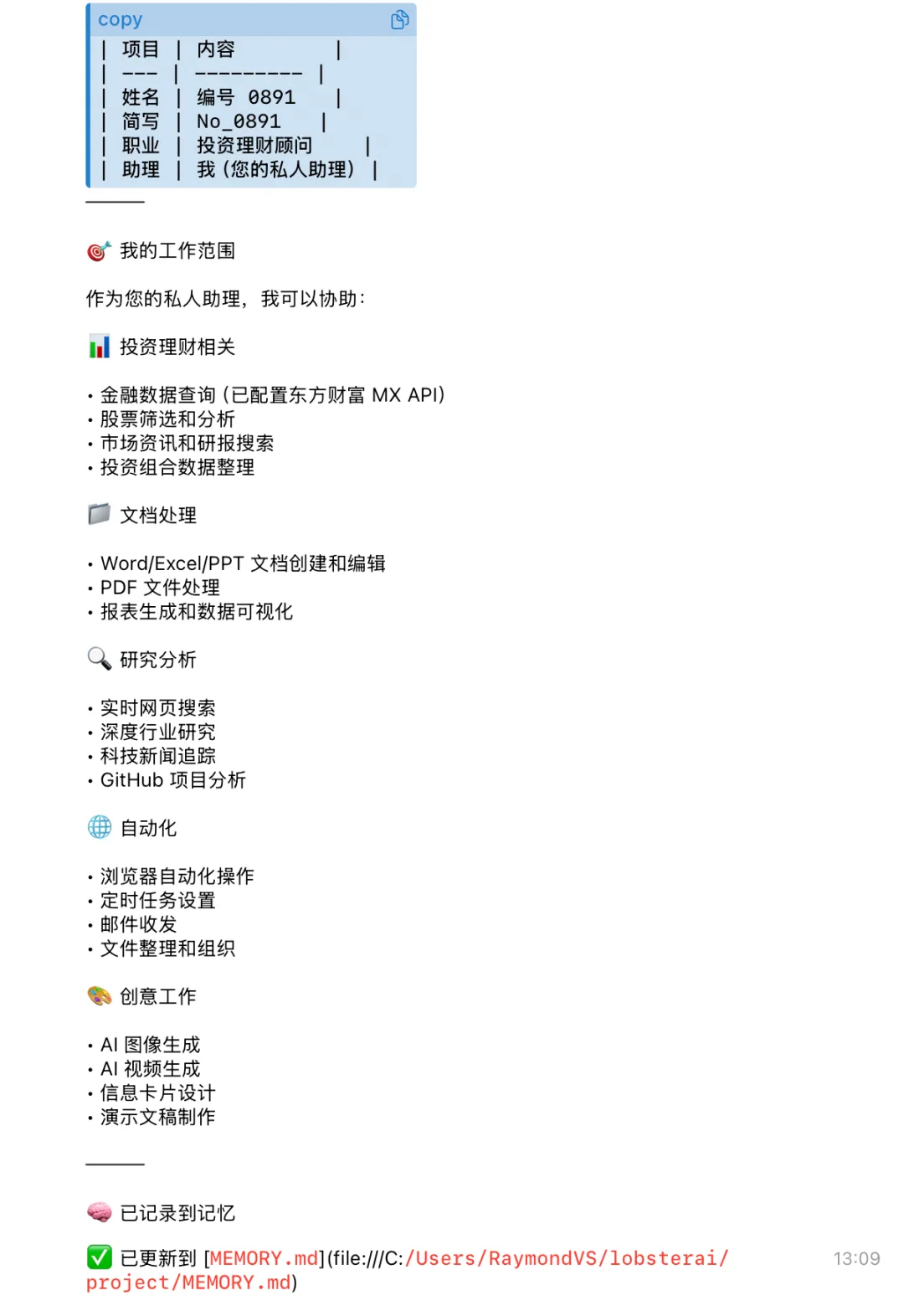 腾讯总部的一场500人的小龙虾安装活动,把Openclaw推入到大众的视野,越来越多人纷纷加入到养“虾”人的队伍。养“虾”的本质,确实非常类似饲养一个电子宠物,汉语也是博大精深,这养虾二字非常值得琢磨。但借用修仙小说的设定,我觉得调试Openclaw的过程,更像一个修士给自己炼制一具自己的分身,所谓的养“虾”,本质就是将工作和生活中的各种工作流,拆解成不同的技能,将各种技能转换成Skill配置文件,把这些“技能”包投喂给Openclaw。你希望Openclaw干什么活,就去Github或者Clawhub这样的技能超市里寻找有没有对应的技能,让Openclaw自己去下载安装。进阶或者高级一些的玩法,就是根据自己的定制需求,自己去写Skill配置文件。安装好Memory记忆系统,定义好角色、身份,安装好技能审计、自我成长这几个基础技能之后,便可以根据自己的需求,配置不同的技能,在我的技能包里,就特别配置邮件发送、金融数据查询、股票筛选和分析、数据分析及可视化这样的技能。