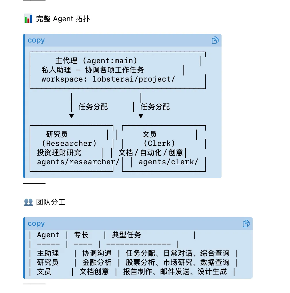 依托AI技术的“一人公司”(OPC,One Person Company)正在加速落地实现,当你的Openclaw配置了非常多的技能变得很“臃肿”了之后,就需要通过多智能体(Agents)来打造你的专属智能团队了,将不同的工作任务交给不同的角色,专人专岗,负责不同的工作任务。目前我是创建了两个Agent:一个是研究院,一个文员。