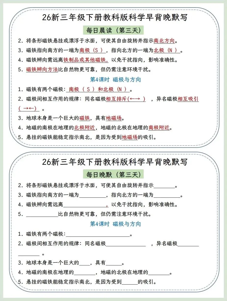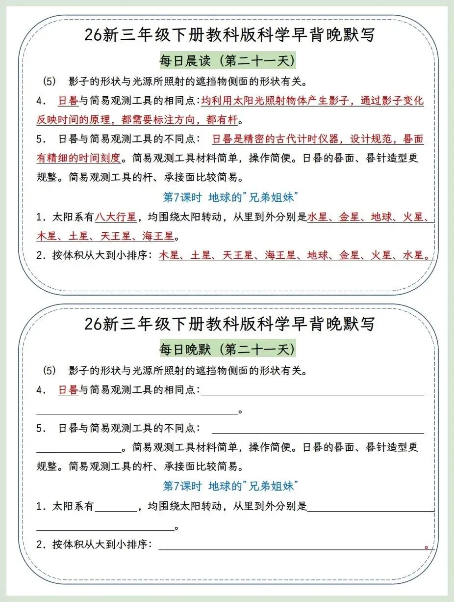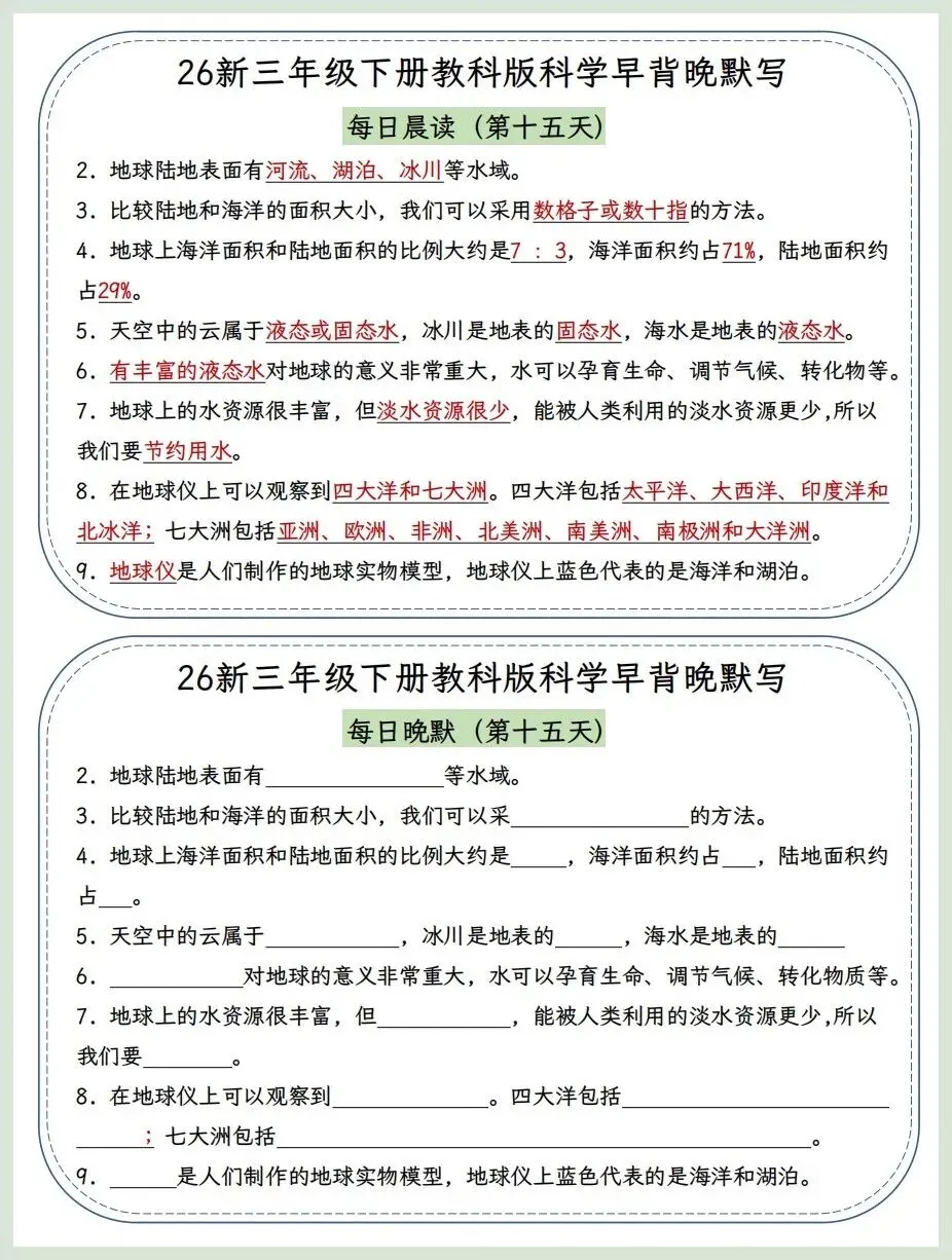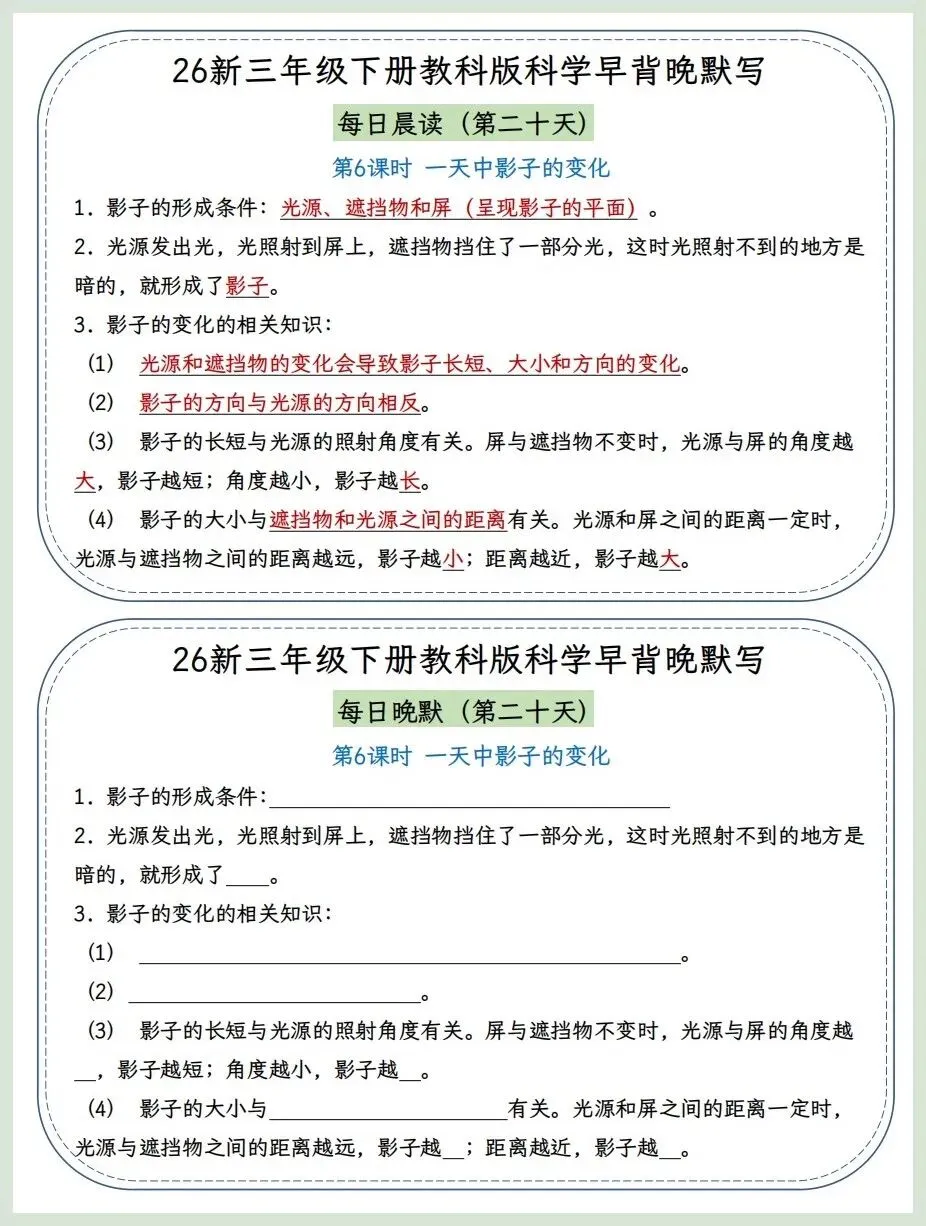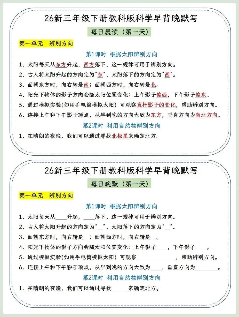 26春三年级下册教科版科学早背晚默小纸条22页【电子版可打印】 点击蓝字 关注我们 今天给大家分享:26新三年级下册教科版科学早背晚默 22页,有需要的可打印出来多练习! 文末有完整电子版领取方式 早背晚默22页 END 领取完整电子版 感谢观看❤ ①: 1-6年级全册精品资料 ③:在公众号对话框回复《 202606》 ②:关注下方公众号 仙女都在看 点点点,赞和在看都在这儿!