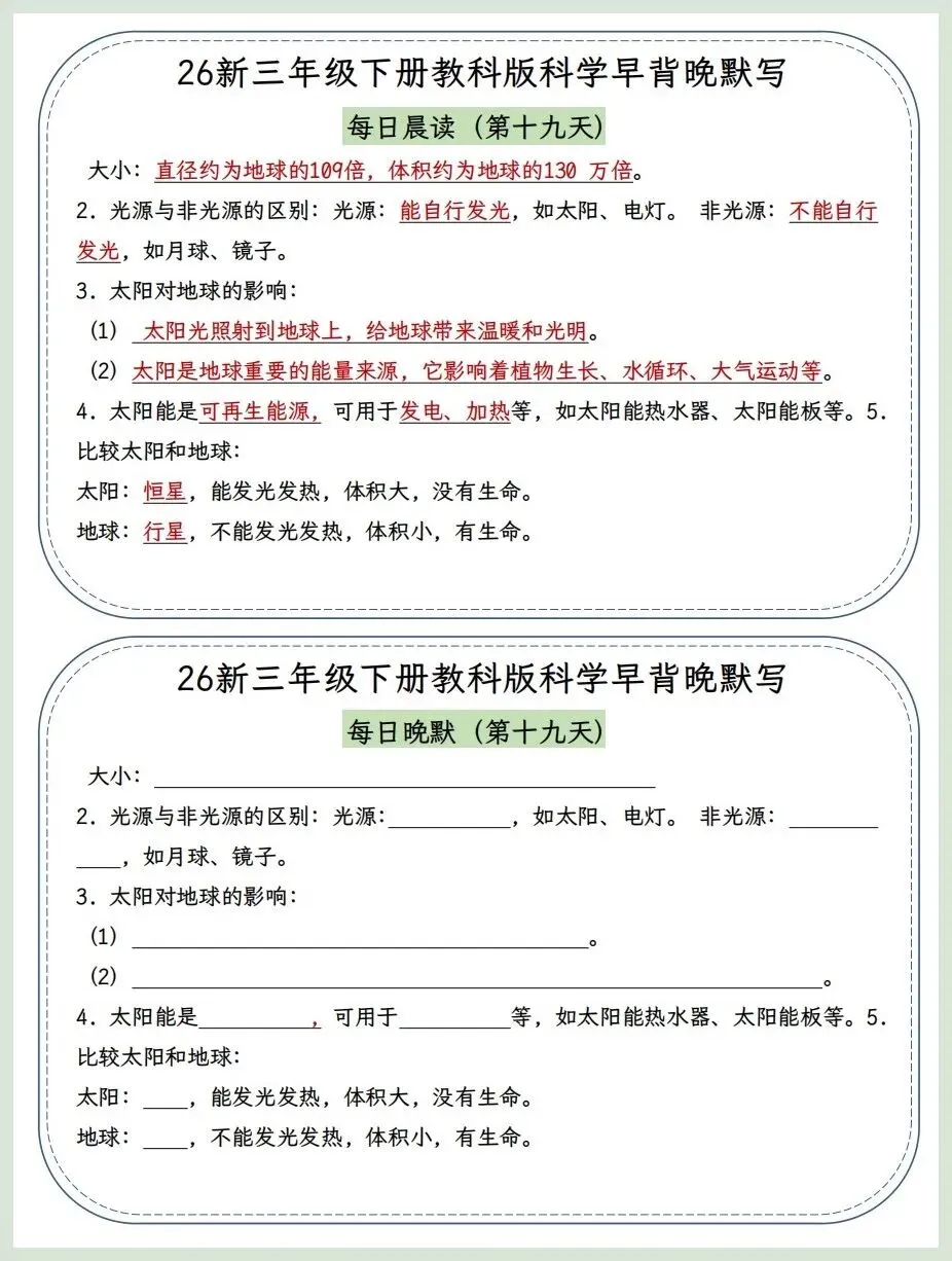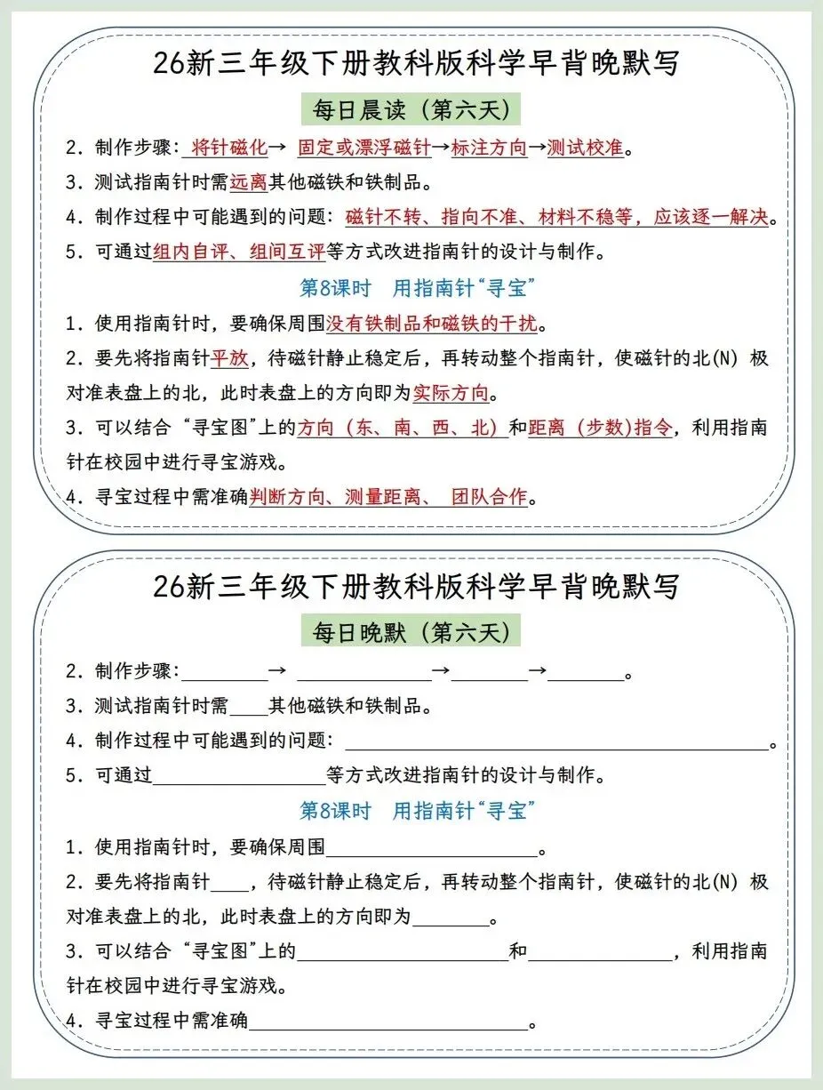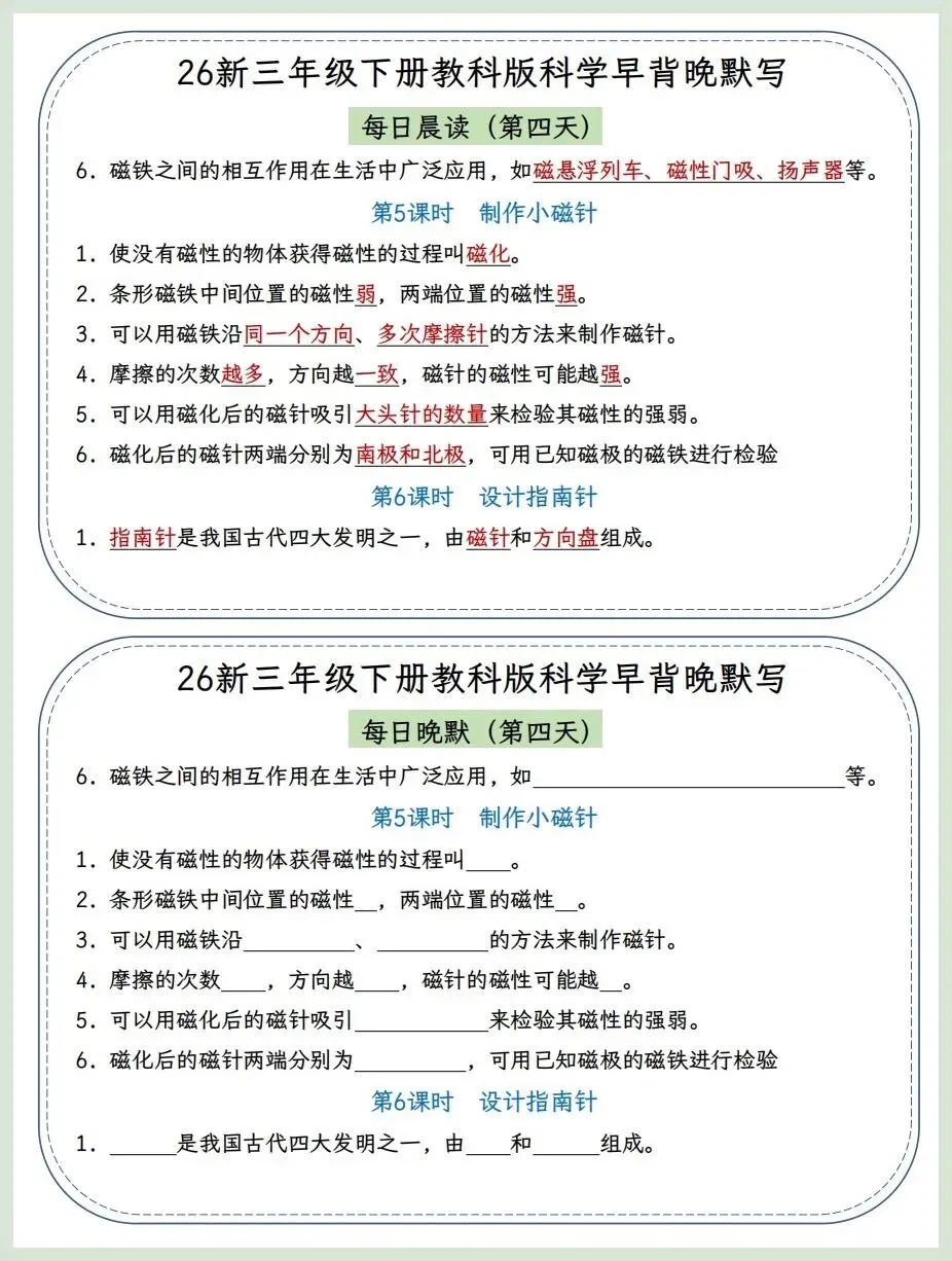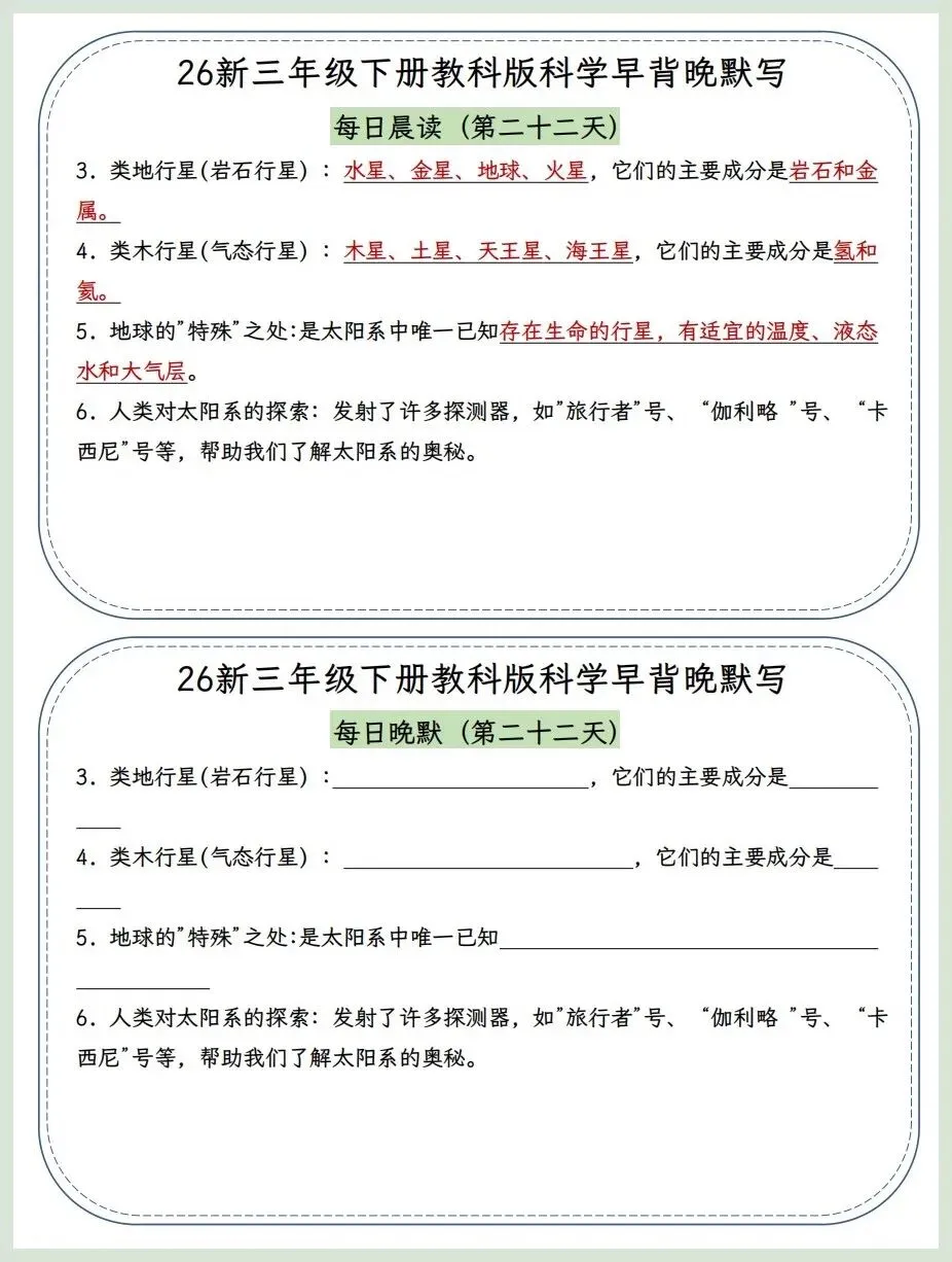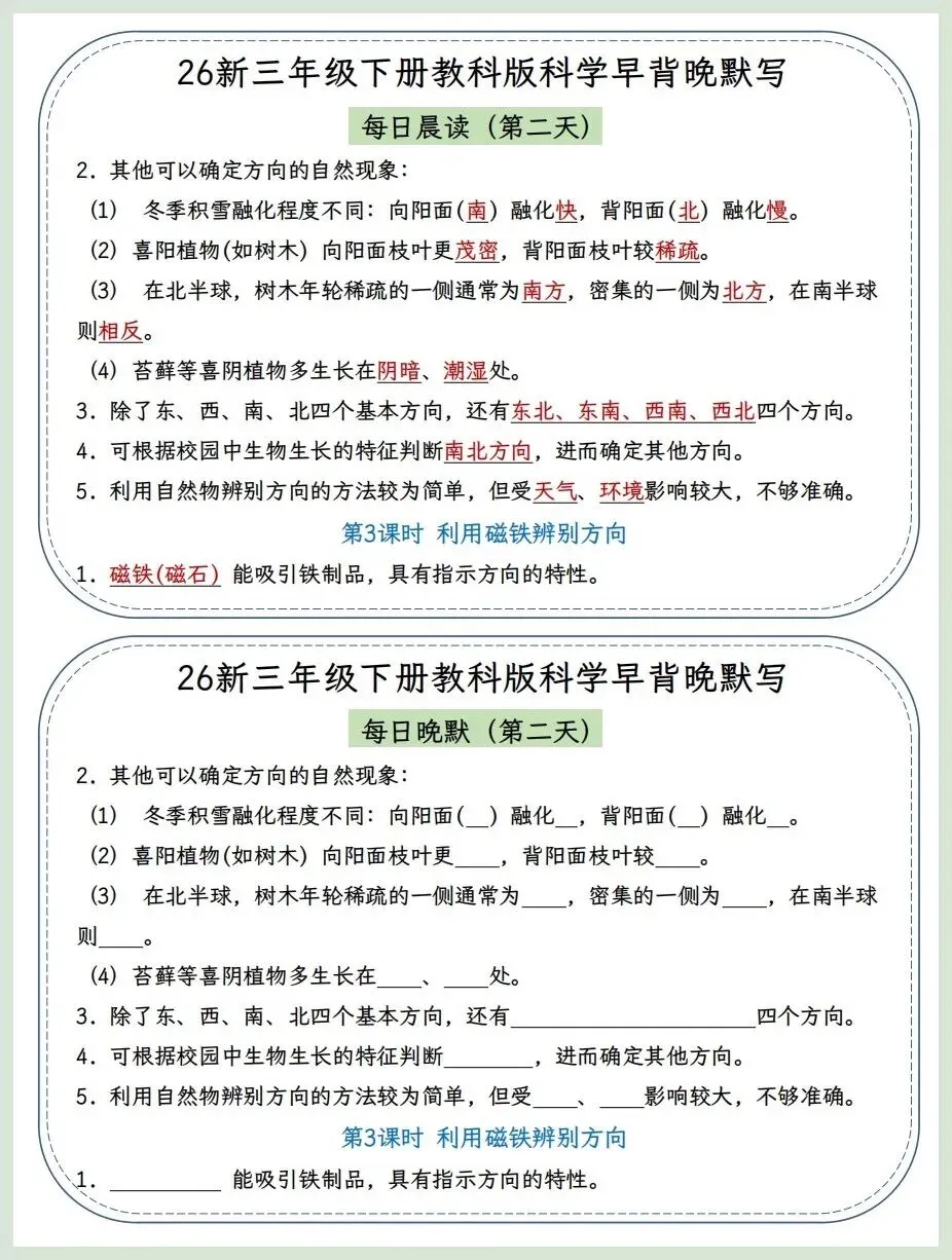 26春三年级下册教科版科学早背晚默小纸条22页【电子版可打印】 点击蓝字 关注我们 今天给大家分享:26新三年级下册教科版科学早背晚默 22页,有需要的可打印出来多练习! 文末有完整电子版领取方式 早背晚默22页 END 领取完整电子版 感谢观看❤ ①: 1-6年级全册精品资料 ③:在公众号对话框回复《 202606》 ②:关注下方公众号 仙女都在看 点点点,赞和在看都在这儿!