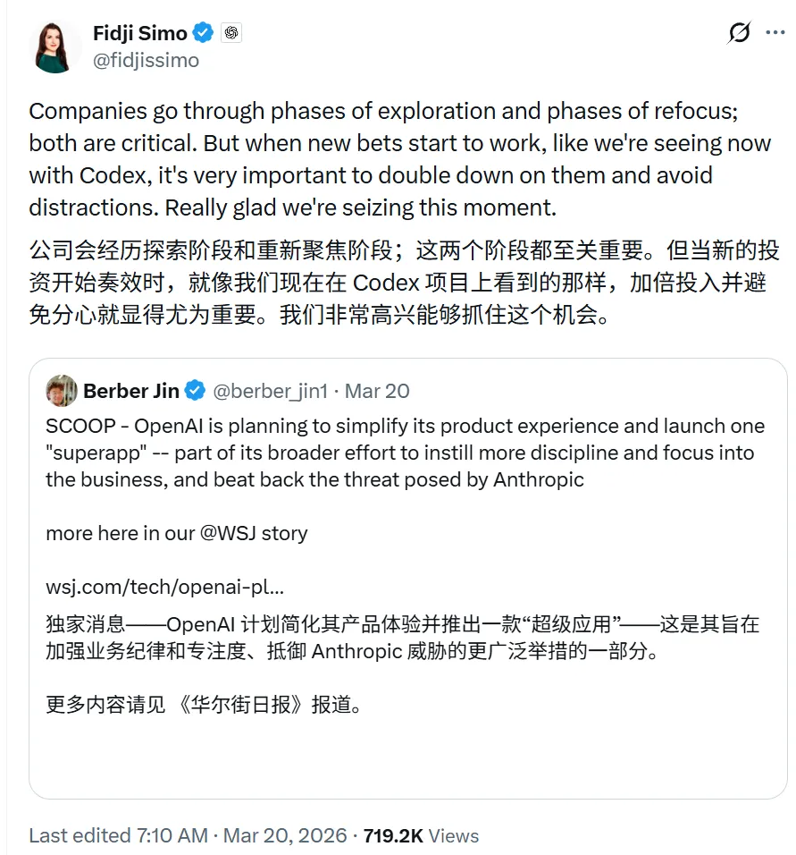 消息是华尔街日报先爆的,OpenAI 自己马上确认了。负责人是应用 CEO Fidji Simo,Greg Brockman 盯技术重组。