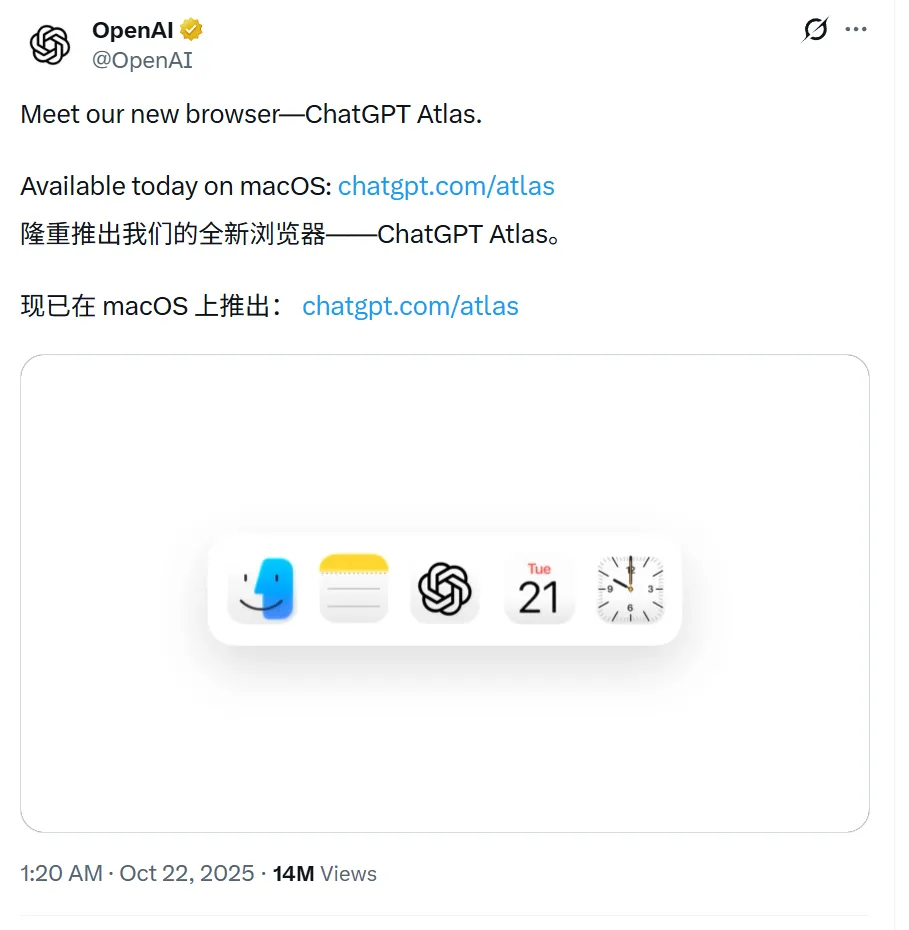 Atlas,AI 原生浏览器,目前只有 macOS。这个浏览器不是给你上网用的,是给 AI 上网用的。你让它去查个东西、抓个数据、跑个流程,它自己打开网页去操作。