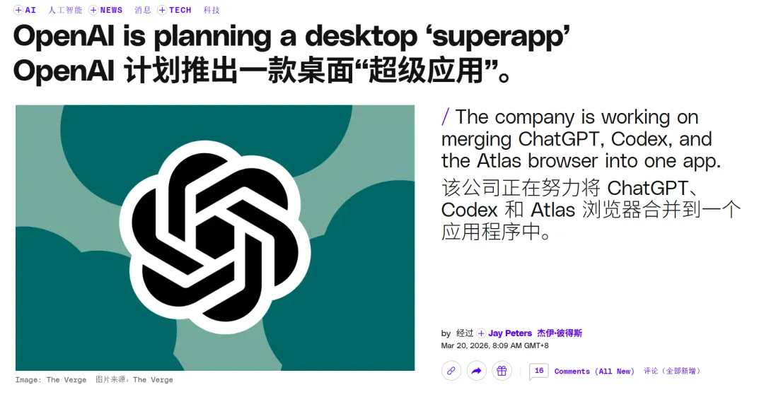 OpenAI 这次做超级 APP,就是在赌这件事。它赌的不是”三合一比三个分开好用”,它赌的是:AI 时代的桌面入口只会剩一两个,我得是其中一个。