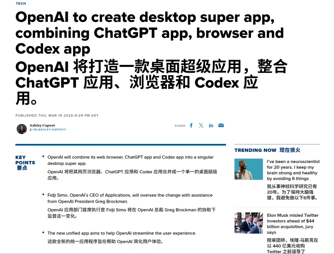 OpenAI 要把 ChatGPT、Codex、Atlas 浏览器三个产品合成一个桌面 APP。