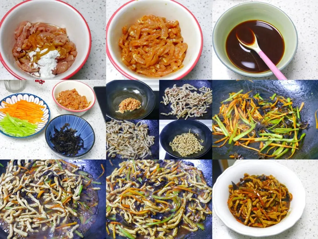 鱼香肉丝的具体做法:1、准备一块猪里脊先切成片,再切细丝,然后放入碗中加少许生抽、玉米淀粉和油抓匀,腌制10分钟,这样肉质更嫩不柴。2、准备半块胡萝卜,去皮后先切片再切丝;青椒去掉里面的籽和筋膜,切成细丝,放入盘子中备用。3、木耳泡发好后去蒂,放入开水锅中焯一分钟左右,捞出来过凉水,再切成细丝备用。4、提前调好酱汁:碗中加入一勺白糖、一勺陈醋、一勺生抽、半勺老抽和少许玉米淀粉,再加少许清水,搅拌均匀备用。5、锅中倒油,油热后倒入腌好的肉丝,接着用筷子扒拉一下,一直炒到肉变色就行。6、盛出来备用。7、不用洗锅,直接放少许甜面酱,炒出酱香味。因为孩子不喜欢吃豆瓣酱,你就用甜面酱来代替了。8、再加入胡萝卜、青椒和木耳丝,一直翻炒到断生。7、接着再倒入炒好的肉丝翻炒一下。8、然后淋入提前调好的料汁,大火翻炒至汤汁裹满食材、变得浓稠。9、觉得甜的话可以加一点点盐,然后就可以出锅了,最后就可以出锅了。