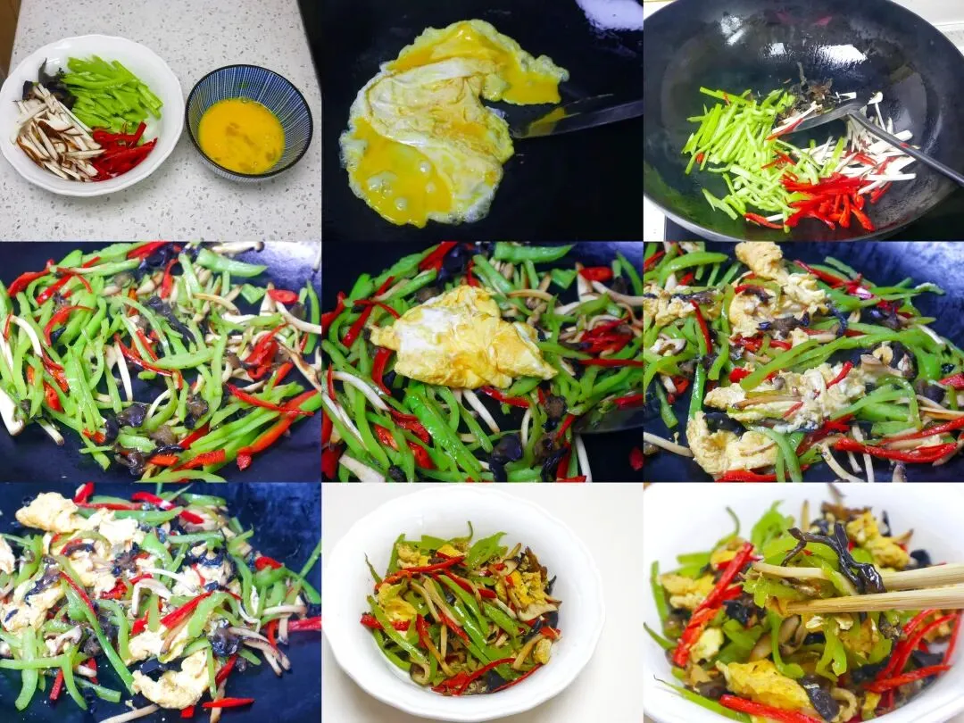 彩丝炒鸡蛋的具体做法:1、干木耳用温水泡发后,反复清洗干净焯水后切成细丝;香菇去蒂洗净,同样切成细丝;菜青椒、菜红椒洗净,去籽去蒂后切成均匀的细条;鸡蛋打入碗中,加少许清水和盐搅打均匀备用。2、先润润锅,把油倒出来后不用倒油,再次烧热后倒入蛋液,能到蛋液底部凝固后,用筷子轻轻划散,炒成金黄的鸡蛋块,盛出备用。3、锅里也不用倒油,就用锅里底油,直接放入木耳丝、香菇丝和青椒丝。4、翻炒1-2分钟后,炒出菌菇的香味,锅边淋点水。继续大火翻炒,一直到彩丝微微变软。5、接着倒入之前炒好的鸡蛋块。6、快速翻炒均匀,让鸡蛋和食材充分融合。7、最后加入适量盐和少许味精调味,大火快速翻炒10-20秒,让调料充分溶解,即可关火出锅。8、装入盘子中就可以啦,鲜香开胃,非常下饭。