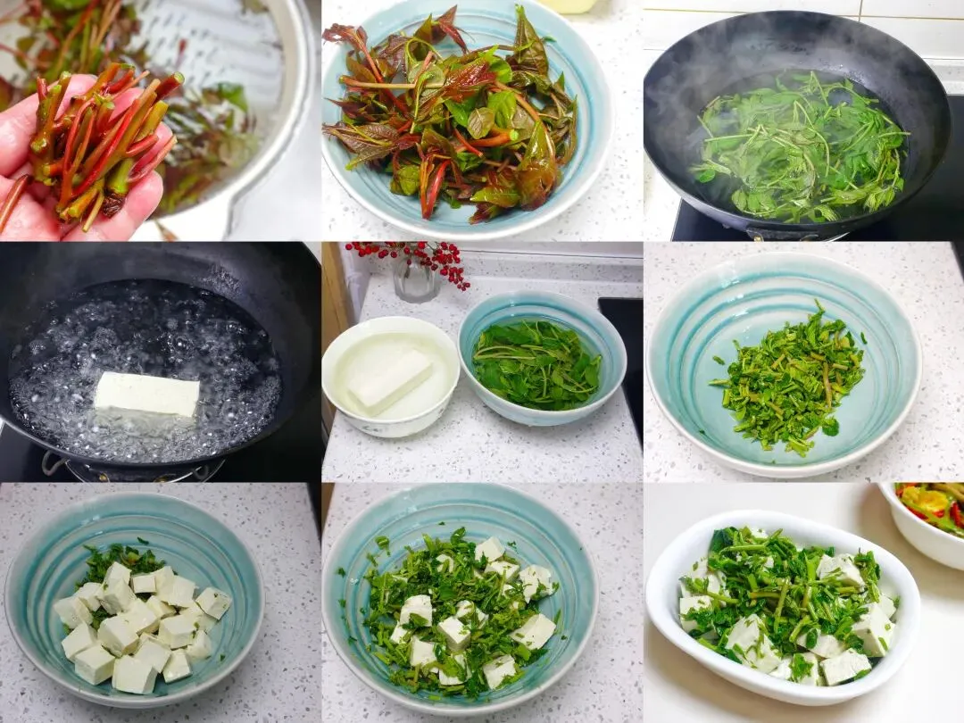 香椿拌豆腐的具体做法:1、准备一个香椿和一盒嫩豆腐。2、接着先处理香椿,香椿的根部比较硬,我把根部硬的地方掰掉了。3、然后淘洗干净,控干水分备用。4、一盒豆腐我用了一小半,豆腐我用的是柴火嫩豆腐,不是内酯豆腐。我觉得这种豆腐更香,内酯豆腐总有一股味道,我不太喜欢。4、锅中烧水,水开后先下豆腐,加一点盐,既能去豆腥味,也能让豆腐更紧实。大概煮2分钟左右就行,捞出过一遍凉水备用。5、同一锅开水里下香椿,不要煮久,变色后大约40秒就捞出来,也过凉水。6、这是过凉水后的豆腐和香椿。7、接下来把香椿挤干水分,切碎。8、豆腐也切成小丁,一起放碗里。先加生花生油,注意用生豆油更香。9、再放入盐、味精。注意别用筷子搅,容易把豆腐搅碎、搅烂,戴个手套,用手轻轻抓拌均匀就可以。10、装入碗中即可,跟烧饼一起吃太搭了。11、做香椿拌豆腐,一定要放生豆油或生花生油!因为生油清香不抢味,能最大程度保住香椿的鲜,豆腐也更嫩,热油一浇香味就散了,口感还发腻。