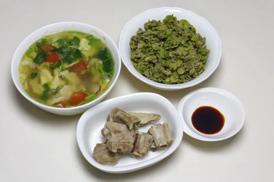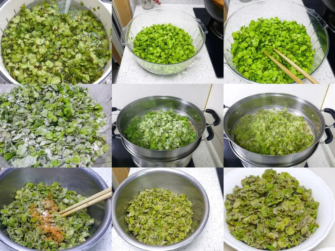 蒸榆钱的具体做法:1、把榆钱放入盆中,加水反复清洗干净。榆钱特别不好洗,里面会夹杂小树枝、硬梗,洗的时候一定要挑干净,不然吃着硬、影响口感。另外榆钱上的小黑点是正常现象,不用刻意抠掉,洗的时候掉了就掉,不掉也不影响吃,放心就行。2、洗好的榆钱一定要彻底控干水分,水分不干后面会粘成坨,蒸出来不好吃。3、控干水的榆钱放入盆中,先加少许食用油拌匀。加油后榆钱不粘连,还更容易挂粉,这是蒸菜不坨的小技巧。4、接下来开始拌面粉,我用的是一半荞麦面粉 + 一半小麦面粉,控糖更友好。不喜欢荞麦的,直接用普通小麦粉也可以。5、面粉少量多次加,用手轻轻抖拌,让每片榆钱都薄薄裹上一层粉就行。千万别用力抓,一抓就成团,蒸出来就坨了。6、蒸屉上铺好屉布,把拌好粉的榆钱薄薄铺一层,不要太厚,多了就分两层蒸,这样熟得快、不粘连。7、水开后上锅,大火蒸 6~7 分钟即可,时间长了会发粘、发黄。8、蒸好立刻关火取出,千万不要焖!趁着热气用筷子快速抖散,凉了就粘在一起,很难散开。9、等榆钱放到温热,加少许盐、南德料、味精拌匀。我之前已经拌过油,不想太油腻,我就没有放油。想更香就滴几滴香油,喜欢蒜香的可以加蒜末、小米辣,按自己口味调就行。10、把调料拌匀后装盘即可。