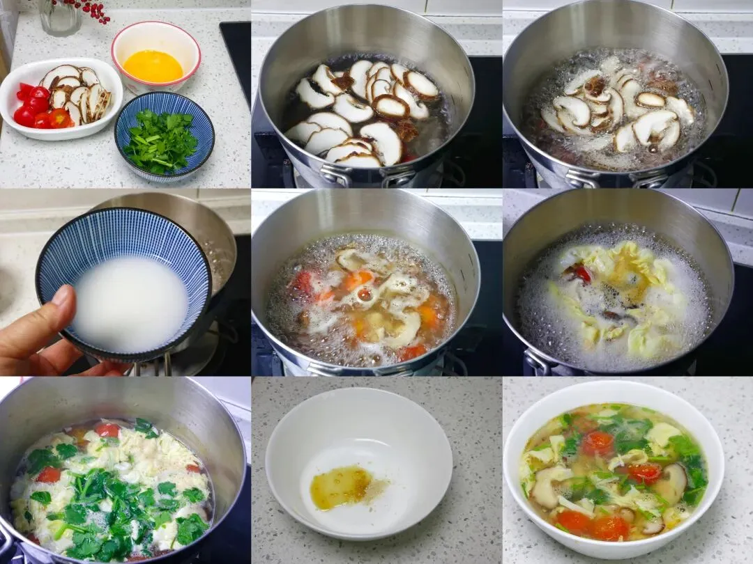 香菇鸡蛋酸汤的具体做法:1、先把番茄清洗干净,切成小块;香菇也清洗干净,切成薄片;鸡蛋打入碗中,加一点点盐,充分搅散;香菜去掉根部,清洗干净,切成小段,放入碗中备用。2、准备一个雪平锅,直接加入适量的清水,放在火上开始煮。等锅里的水烧开之后,先放入圣女果和香菇。3、这两样比较耐煮,先煮 2~3分钟左右,把圣女果和番茄的汤汁充分煮出来,汤才会更鲜更有味。4、提前调好一点玉米淀粉水,稠稀度根据自己的口味来,喜欢浓一点就调稠一点,喜欢清淡就稀一点。把淀粉水慢慢淋进锅里,边倒边搅拌,防止结块,让汤变得微微浓稠。5、等到锅里的汤再次煮开。6、接着转圈淋入提前打散的鸡蛋液,等鸡蛋液慢慢凝固,形成漂亮的蛋花。7、等到蛋花浮起来、汤再次煮开后,撒上准备好的香菜,就可以关火了。8、准备一个喝汤的碗,碗里提前放入:少许盐、菌菇粉和几滴香油。9、把煮好的香菇鸡蛋汤倒入碗中,搅拌一下,让调料完全融合在汤里就可以啦。