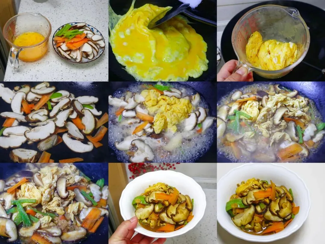 香菇炒鸡蛋的具体做法:1、鸡蛋打入碗中搅散备用。香菇洗净切片,胡萝卜切片,青椒去筋去籽切成小片备用。2、锅中倒油,一定要提前把锅润透,这样鸡蛋才不会粘。油热后倒入鸡蛋,炒到两面金黄,先盛出来备用。3、锅里再放一点点油,放入胡萝卜、青椒和香菇,翻炒几下。4、因为我放油比较少,所以淋上一点水,稍微煮一会儿,接着把炒好的鸡蛋倒回锅中。5、再加点生抽,我不小心倒成老抽了,不过不影响味道,就是颜色不好看,再加适量盐调味。6、继续炖到香菇变软、吸满汤汁,最后加一点点味精。7、再次翻炒均匀就可以出锅啦,鲜香又下饭。