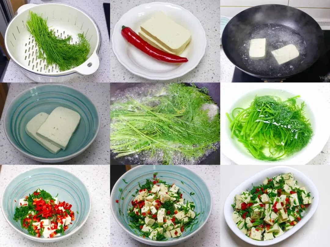 茴香苗拌豆腐的具体做法:1、准备一小块豆腐、一把茴香苗和红椒备用。2、锅中烧水,水开之后先放入豆腐,加点盐,这样能够去除豆腥味。大概煮两分钟左右,我买的是老豆腐,不是嫩豆腐,比较耐煮,煮到里面稍微有蓬松感就可以了。3、然后捞出来,放到碗中加凉水泡一会儿。4、接着再放入茴香苗,煮40秒左右就可以捞出来了,也是跟豆腐一样泡凉水。5、然后把豆腐冲洗一下,切成小丁放入碗中。茴香苗控干水分、挤干后切碎,再准备点红椒切成小粒,都放在一起。6、接下来就可以调味了,这个菜不用放太多调料,吃的就是鲜嫩。只需要加点香油、盐、味精,搅拌均匀就可以了。7、最后装入盘中就能吃,这道菜非常爽口解腻、清淡又下饭,老人孩子都爱吃。
