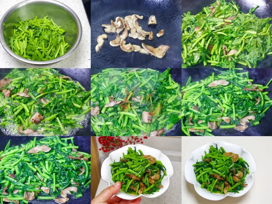 梅花肉炒茼蒿的具体做法:1、准备一把茼蒿,去掉根,清洗干净,控干水分后切成小段;梅花肉切好备用。2、锅中烧热,放一点油,油热后放入梅花肉,开小火慢慢煸出油脂。3、接着放入茼蒿,翻炒一下。喜欢吃蒜的可以放点蒜,因为我妈不吃蒜,所以我就没放。4、翻炒均匀后可以淋点水,再加盐、南德料,继续翻炒。5、等到茼蒿断生、变软就可以出锅了。6、最后盛入碗中即可。