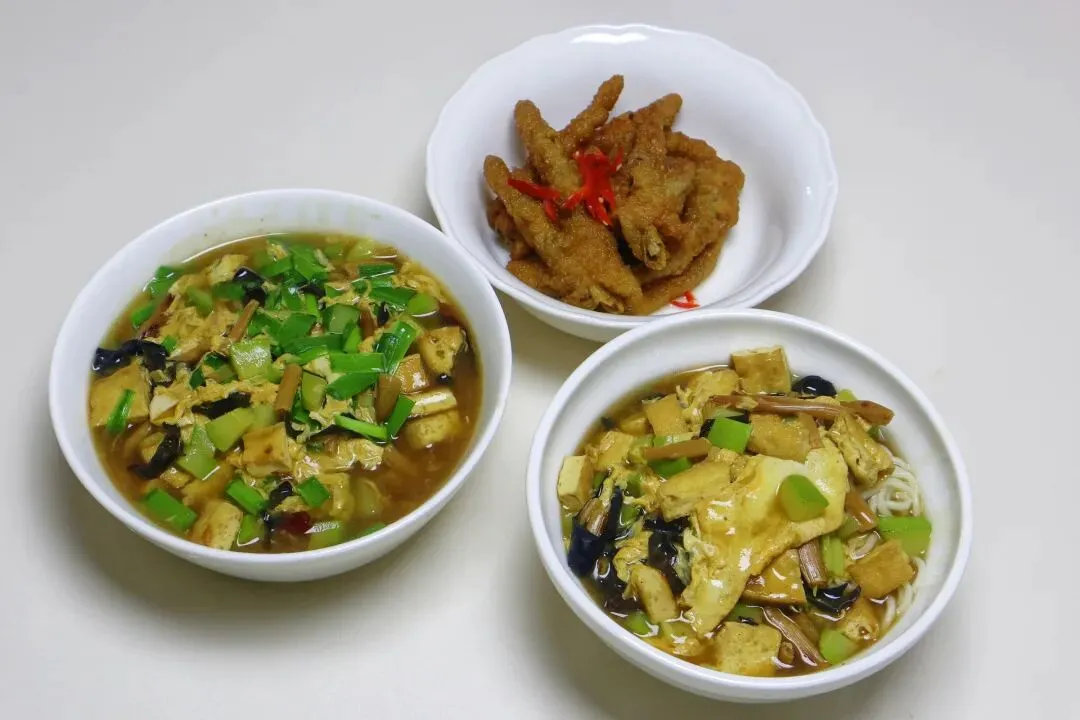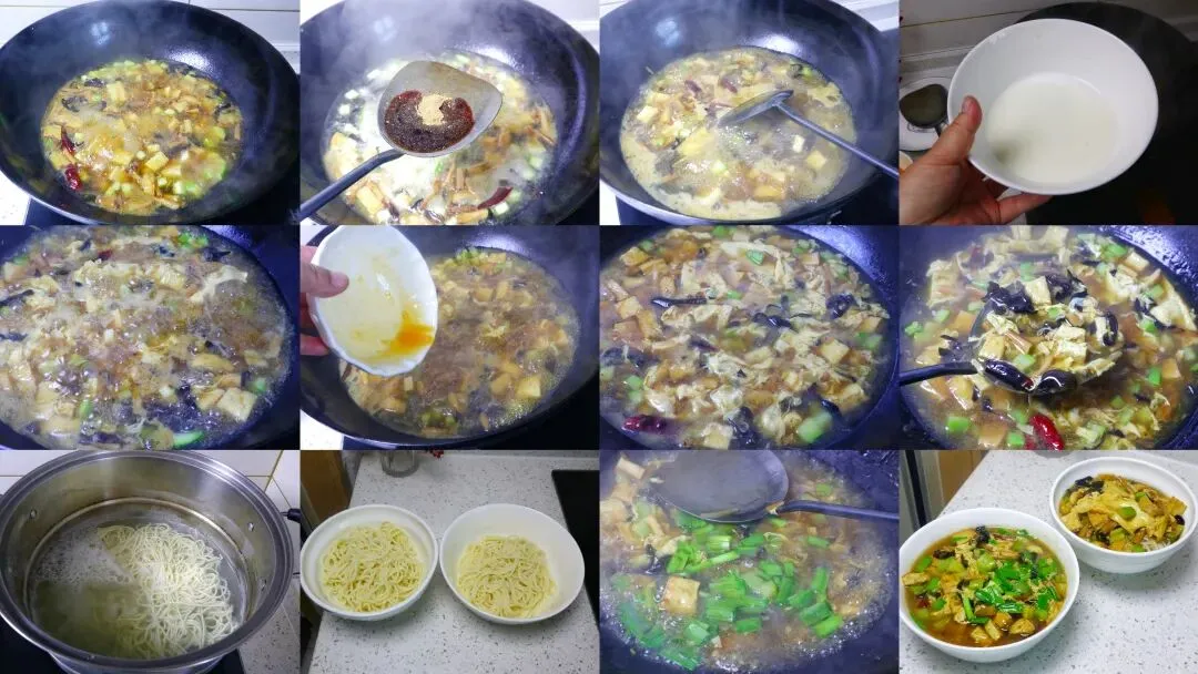 9、翻炒均匀后加入适量清水,大火烧开。10、煮开后开始调味:加少许南德料、十三香、盐、生抽。11、再加老抽上色,转中火煮一分钟左右。12、接着倒入调好的玉米淀粉水,边倒边搅拌。13、再次煮开后淋入鸡蛋液。鸡蛋液刚倒进去先不要动,等定型后再轻轻推动搅匀。14、最后加一点味精就可以关火了。15、接下来煮面条:水开后下面条,我和我妈吃得不多,两个人一块钱的面条就够。煮到面条没有硬心就捞出,过一遍凉水,沥干水分装碗。16、浇上刚才做好的三鲜卤即可。妈妈不吃韭菜,我先给她盛好。我自己的再开火把韭菜放进去,直接关火,浇在面上就可以了。17、吃的时候拌匀,能吃辣的可以再加点辣椒油会更香。