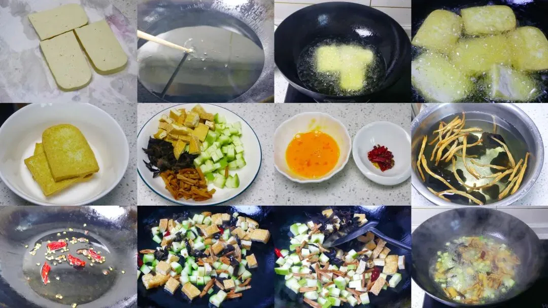 三鲜打卤面的具体做法:1、准备一块豆腐,清洗干净后切成片,不要太薄。用厨房纸把表面水分擦干,这样炸的时候不会溅油。2、锅烧干,倒入适量油,烧至油温合适。不确定温度的话,可以放一根筷子,筷子周围冒小泡就可以了。3、接着放入豆腐片,炸到两面金黄起皮即可,不用炸太狠,炸好后捞出控油。4、提前泡好木耳和黄花菜。5、西葫芦不用去皮去籽,先切条再切丁;木耳去掉根部后切丝;黄花菜切成小段,炸好的豆腐也切成小丁,全部装入盘中备用。6、再准备两个辣椒掰碎,不能吃辣就少放,我这次放得多了点,有点辣。再放少许花椒;碗里打入一个鸡蛋,搅散备用。7、刚才炸豆腐的油锅不用刷,直接开火,油热后放入干辣椒和花椒爆香。8、再放入切好的配菜大火翻炒。我这次木耳没有提前焯水,有点偷懒,炒的时候会噼里啪啦响,介意的朋友可以提前焯下水。