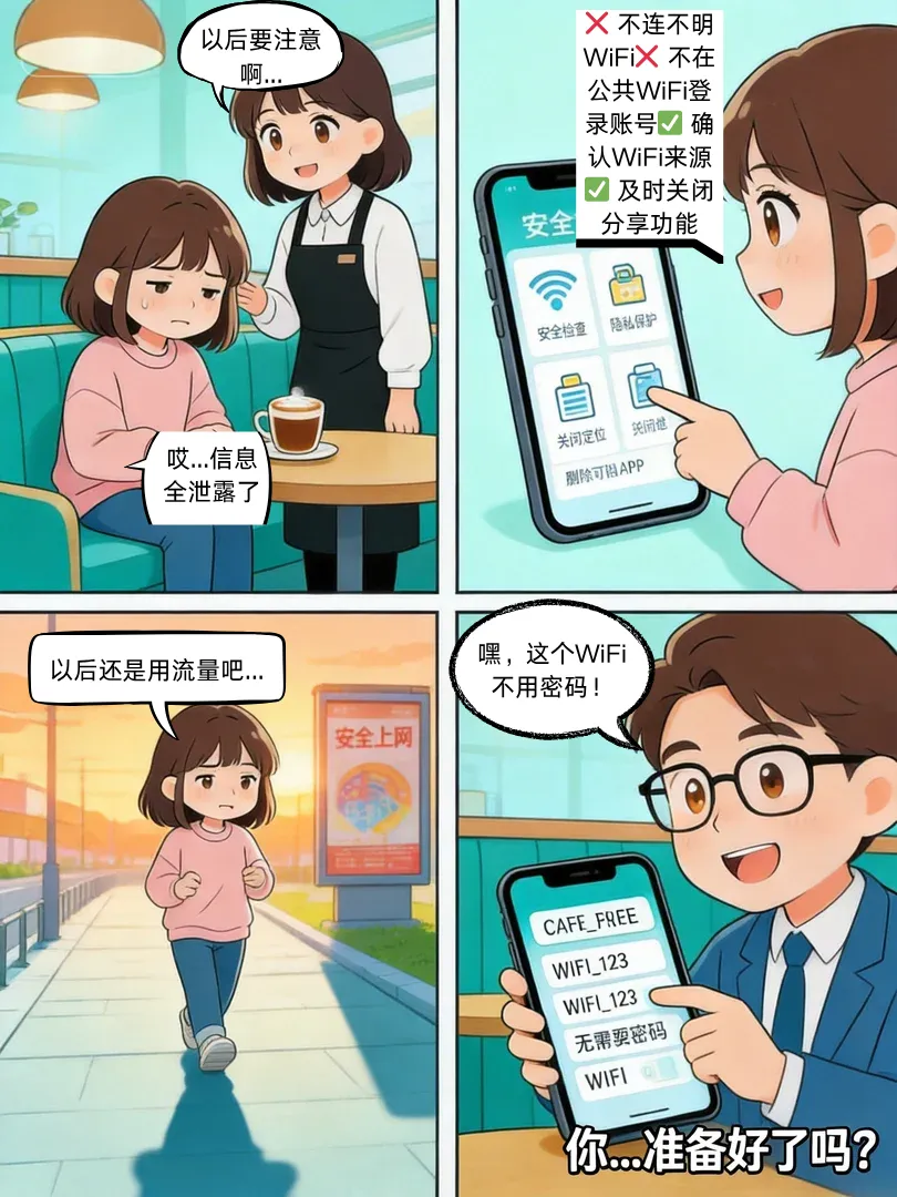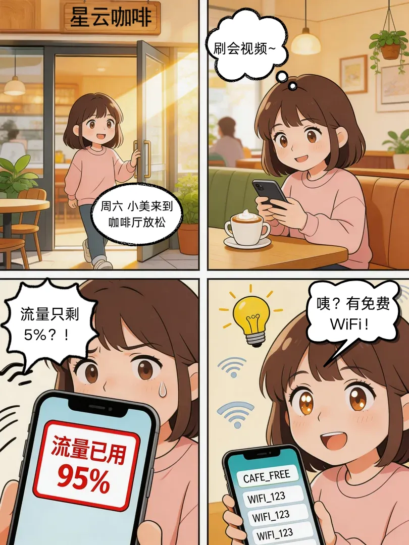 小美在咖啡厅发现手机流量不足,正好看到有”免费WiFi”可以连接…