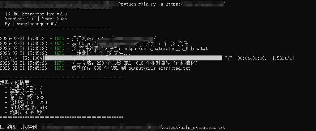 # 准备 URL 列表 (input/file.txt)https://example.com/js/app.jshttps://example.com/js/vendor.js# 运行提取python main.py -u input/file.txt -o output/urls.txt