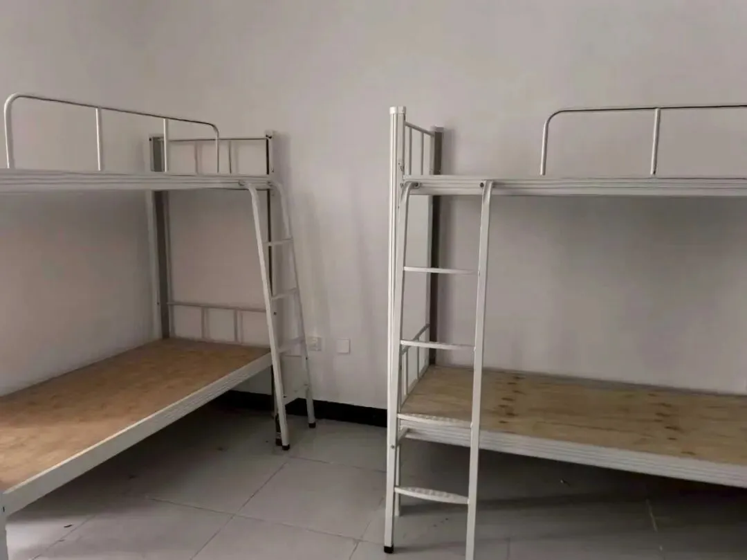 宿舍配备:双层床+床板、采光窗户、防滑地面、白墙、房门、卫生间洗漱池,满足基础住宿。