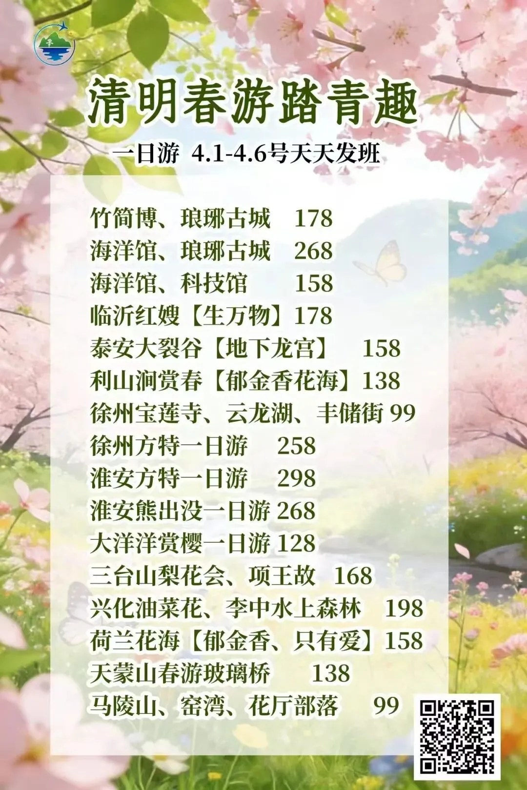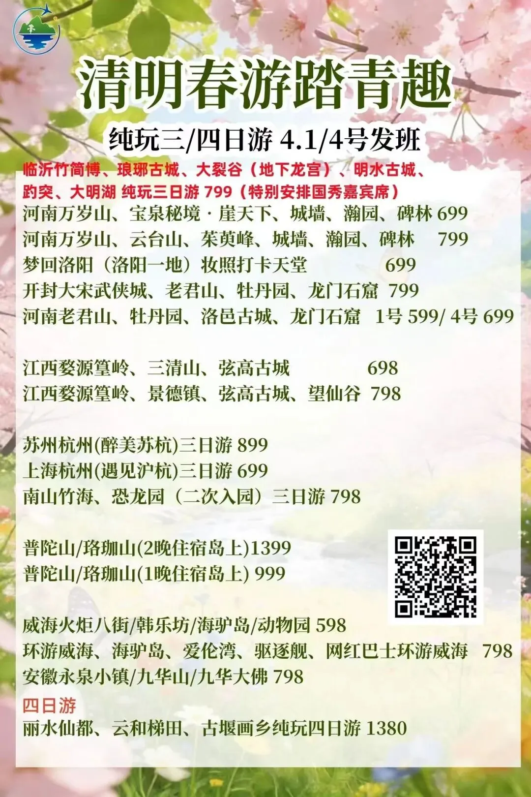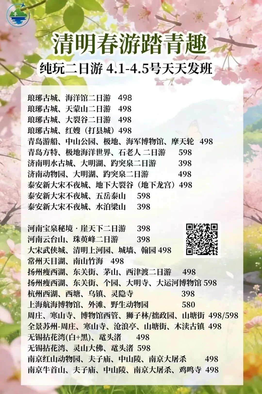 春假•清明•周边短线1-4日合集上线啦 打卡秀美风光,解锁春日限定美景 一键打包吃住玩 这个春天,跟我们去撒野🌊 不负春光,不负假期,现在就出发🚗 旅游门店地址: 海州区建设东路98-35号(苍梧小学东校区北门对面) 联系电话:15951250360(微信同号)