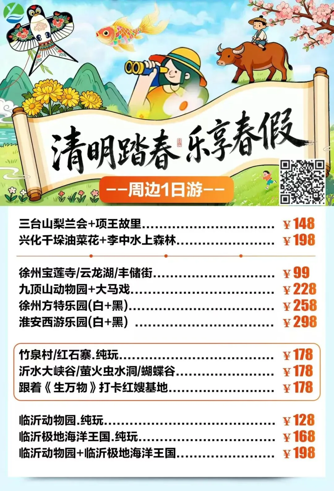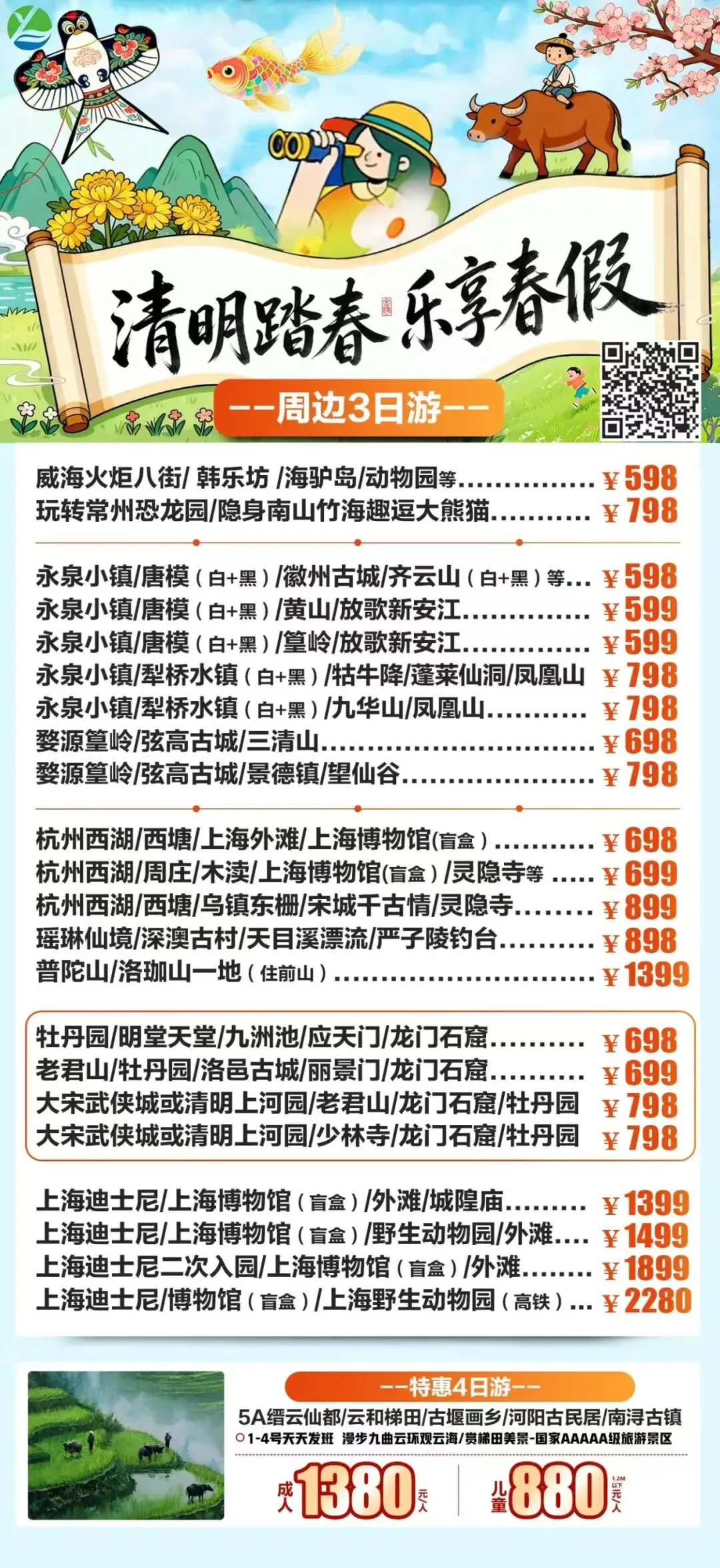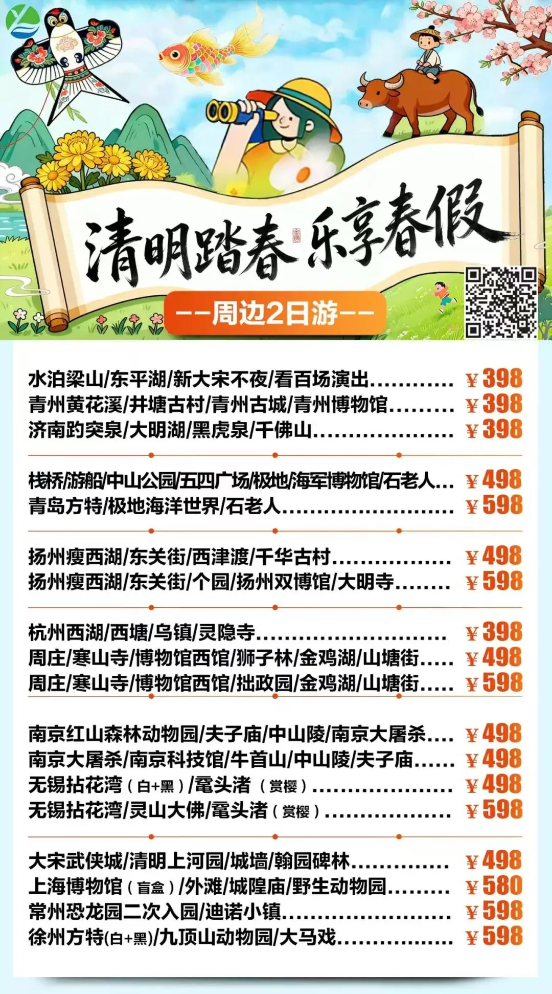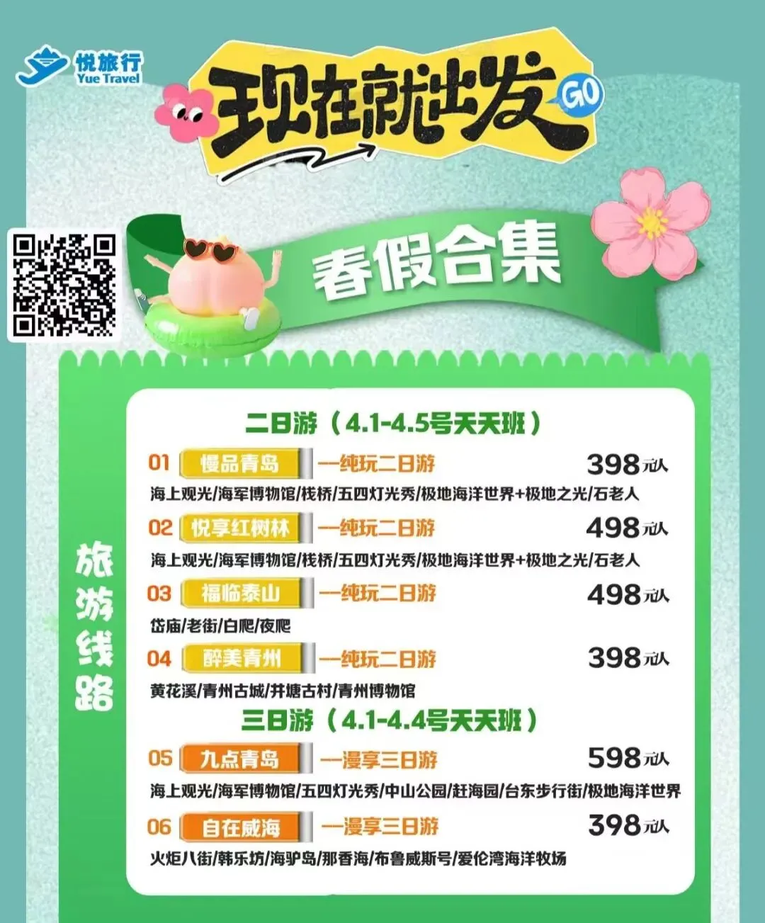 春假•清明•周边短线1-4日合集上线啦 打卡秀美风光,解锁春日限定美景 一键打包吃住玩 这个春天,跟我们去撒野🌊 不负春光,不负假期,现在就出发🚗 旅游门店地址: 海州区建设东路98-35号(苍梧小学东校区北门对面) 联系电话:15951250360(微信同号)