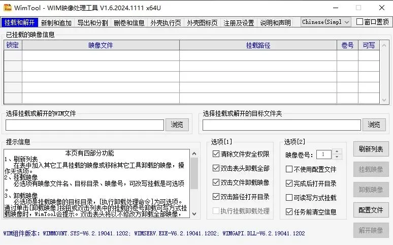 WimTool是一款功能很全、操作也简单的WIM映像处理工具。对普通用户来说,制作映像、挂载映像、解压WIM到硬盘目录、往现有WIM里加新映像卷这些常用操作都能轻松搞定。