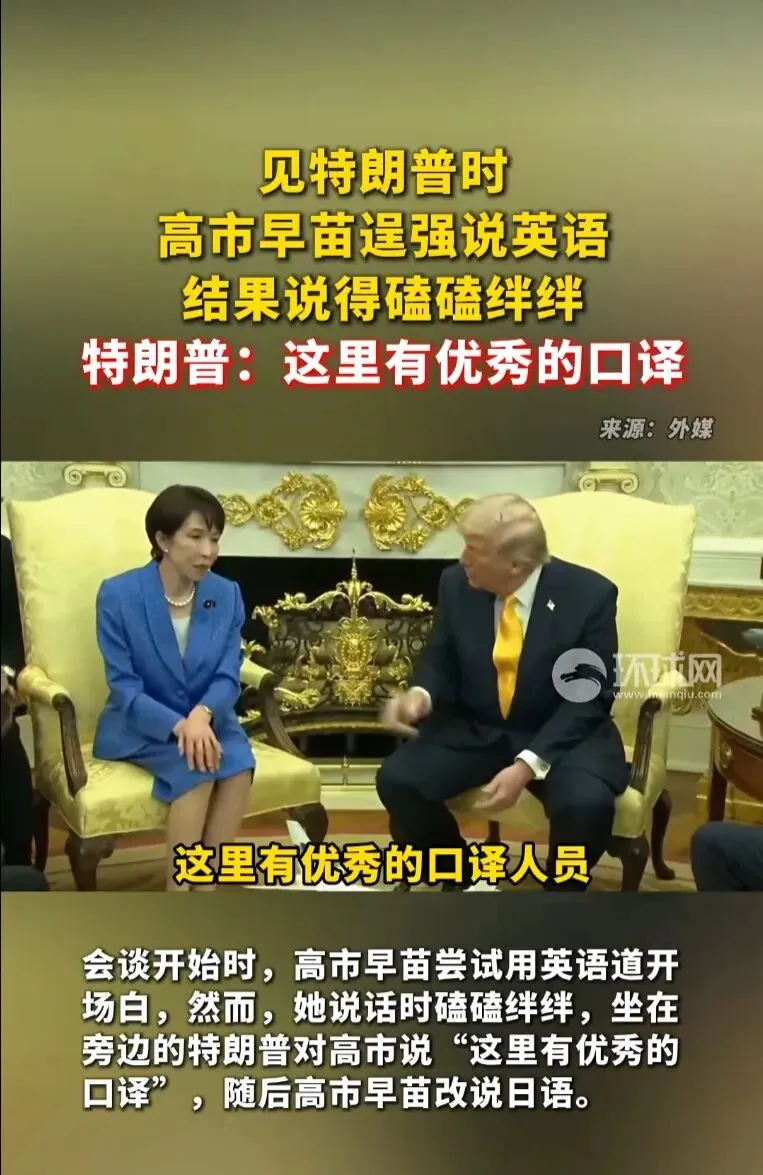 按照会晤的常规流程,开场会有媒体拍摄环节,两人的屁股刚放在小椅子上,高市早苗就主动开口说起了英语,原本是想在特朗普面前露一手,彰显自己的亲美态度,给对方留个好印象。结果,她的英语说得磕磕绊绊、断断续续,连一句完整的寒暄都没顺下来,说着说着还下意识回头找翻译,那窘迫的样子隔着屏幕都替她觉得脸红。对面的特朗普一眼就看穿了她的窘境,没等她硬撑完,当场就来了句:“这里有很好的翻译”,还补了一句“安倍时期我就见过他”。话虽不多,侮辱性极强。高市早苗作为日本首相,放着母语不用非要强行说英语,本质上就是想刻意讨好美国,在特朗普面前刷好感。可偏偏英语能力跟不上野心,这份讨好不仅没到位,反而成了全球的笑柄,完全是搬起石头砸自己的脚。
