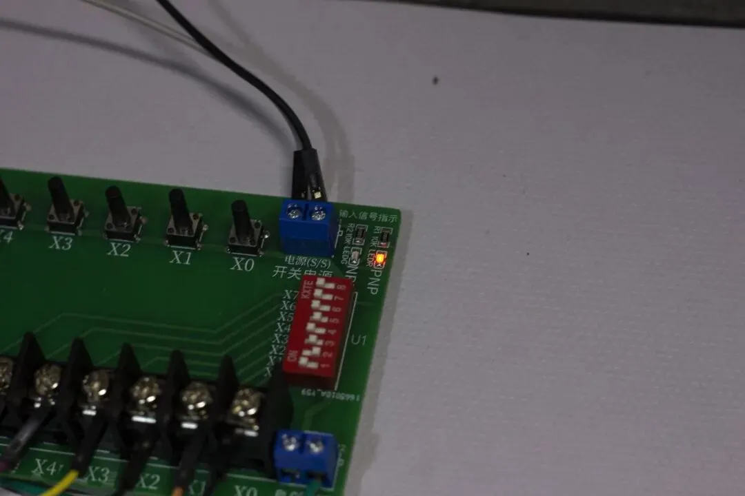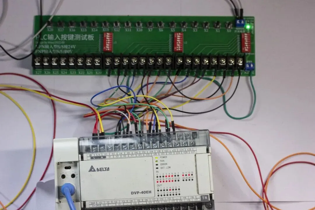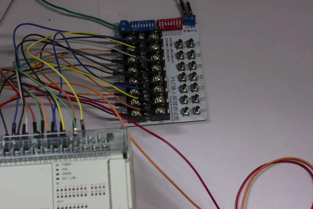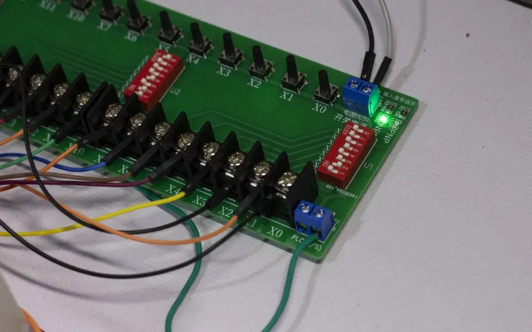 - 连接PLC:使用双公头杜邦线,将板载X点对应连接至PLC的输入端。注意PLC的S/S公共端接线需根据极性调整。