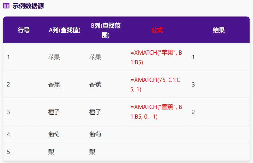 基本语法:=XMATCH(lookup_value, lookup_array, [match_type], [search_mode]) -
