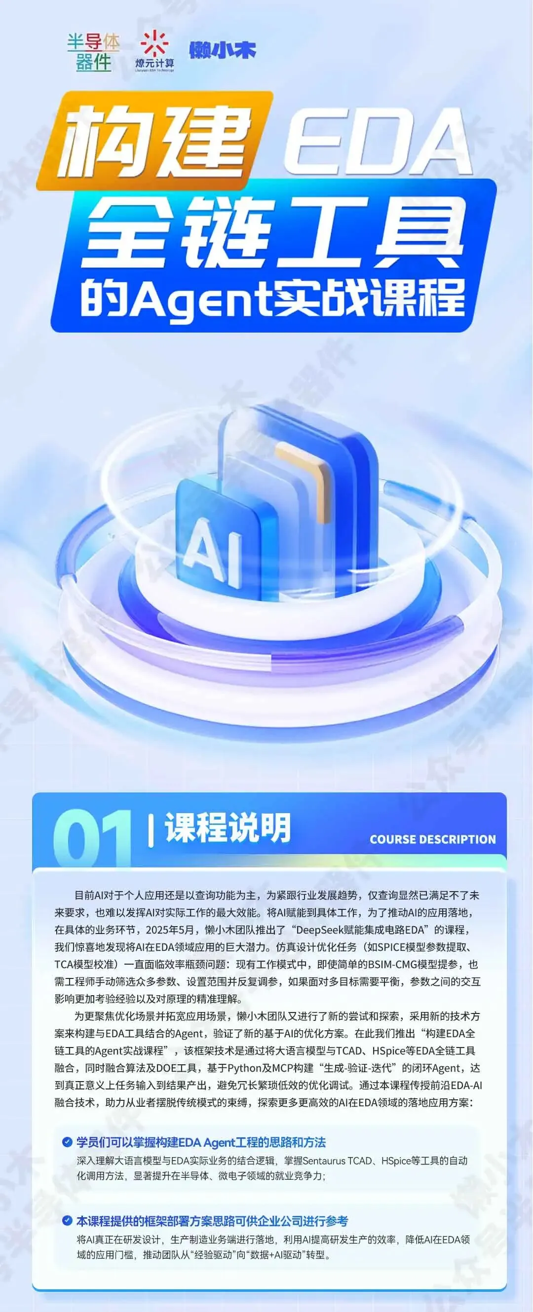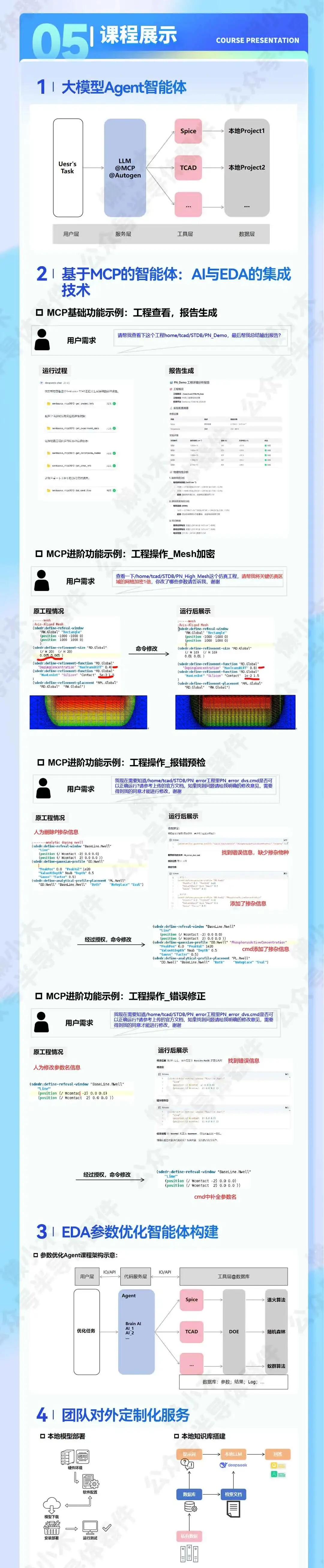 构建EDA全链工具的Agent实战课程 课程一期精彩内容回顾与特色介绍 我们的第一期课程自推出以来,获得了学员们的一致好评,为了让您更全面地了解课程特色,特别分享一期课程的精华内容: 【试听合集】DeepSeek赋能集成电路EDA(TCAD)的实操技术教程 🔍 一期课程核心特色 1.面向EDA工具构建私有化知识库 2.基于AI的交互式数据处理和分析 3.基于AI大模型,实现对话式的EDA交互方式 4.一站式自动化工作流 🔗 查看完整课程大纲 想了解一期课程详细章节、教学安排和完整知识体系?点击此处查看课程一期完整大纲 👉懒小木丨DeepSeek赋能集成电路EDA(TCAD)的实操技术教程 半导体器件 关注我们 更多招聘、资料、课程